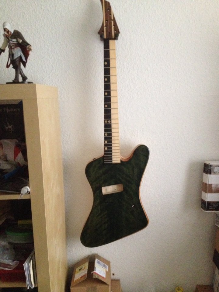 Wie in dem Thread bereits gesagt habe ich während des Baus meine Meinung geändert: Von einem Birdseye Maple Griffbrett zu einem geteilten mit Ebony und entsprechendem Binding und von abgedeckten Tonabnehmern zu offenen mit Naturholzbobbins. Beides war kein Problem und wurde ohne Aufpreis für den Umstand geändert.