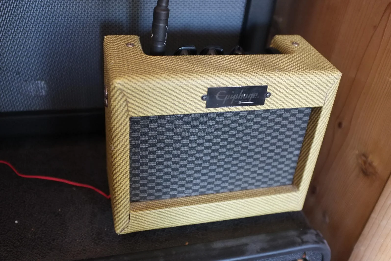 Es handelt sich um den Epiphone EP-1, der irgendwann Mitte bis Ende der 1990er gebaut wurde. Er stand da so einsam und verstaubt im Schaufenster, und auf eine Anfrage bezüglich der Verkäuflichkeit wurde mir glatt mit einem "Natürlich ist der zu verkaufen!" geantwortet. Das Preisschild war jedoch ob der langen Lagerung in der Auslage abhanden gekommen, also wechselte der kleine Zwerg für knappe 20 Öcken seinen Besitzer. Herrlich, wieder einmal ein absolut unnützes Gadget gekauft. Aber ich wollt ihn ja sowieso nur haben, weil er so niedlich aussieht.