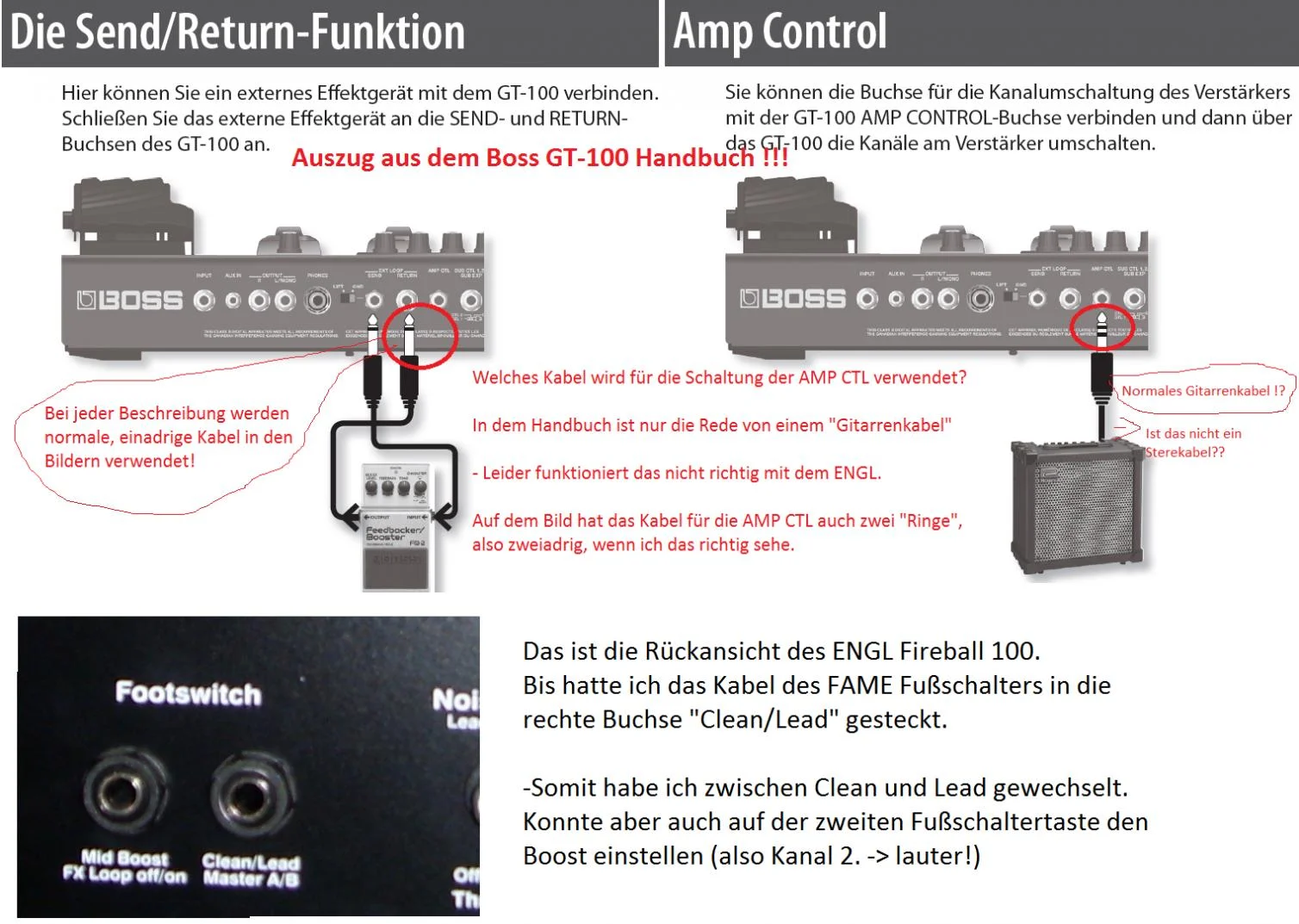 Ich würde mich gerne in die "Wie-geht-das-mit-meinem-Amp-Fragesteller-Riege" einklinken... Und zwar bin ich den ganzen Tag dran und versuche herauszubekommen, wie ein GT-100 so in meinen Amp einschleifen könnte, so dass ich die Vorstufe des Amps zusammen mit dem GT nutzen und dabei die Kanäle des Amps an Presets gekoppelt schalten kann. Ich habe nur leider absolut keine Ahnung von verschiedenen Klinkensteckern, MIDI etc, gerade versuche ich mich in die Thematik einzulesen... Dass mein Vorhaben theoretisch möglich ist, ist mir jetzt klar - bloß funktioniert der Amp Control am GT ja mono.