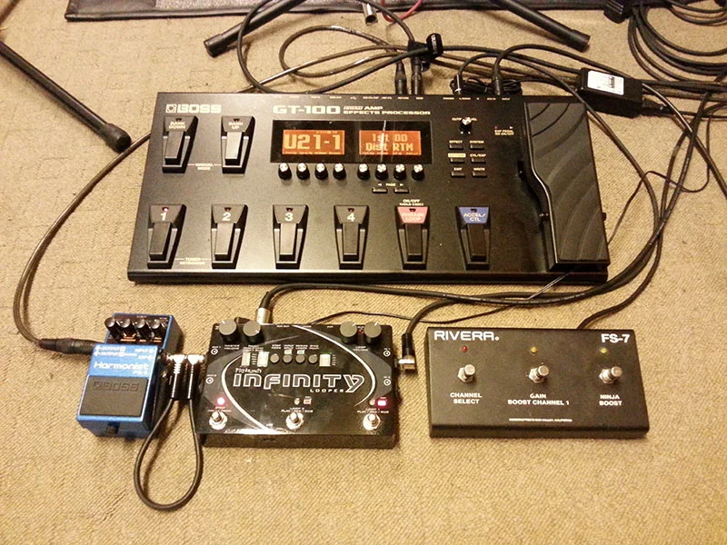 So, und da ich weiß, dass ihr alle gerne Bildchen seht, gibt's zum Schluß noch ein Bildchen von meinem derzeitigen Gear, wie ich das im Proberaum nutze. Es ist schon was älter das Foto, habe mir z.B. für den Infinity Looper noch den Undo/Redo Schalter gekauft.