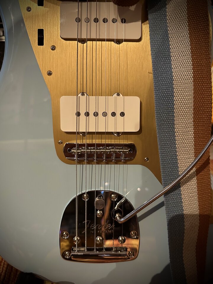 ... es ist aber definitiv eine MIM ... Auch wenn die Farben nicht zu 100% passen, sieht das aber sehr stimmig aus, da die 3 Grundfarben der Gitarre auch im Gurt sind. Zufall halt !!!