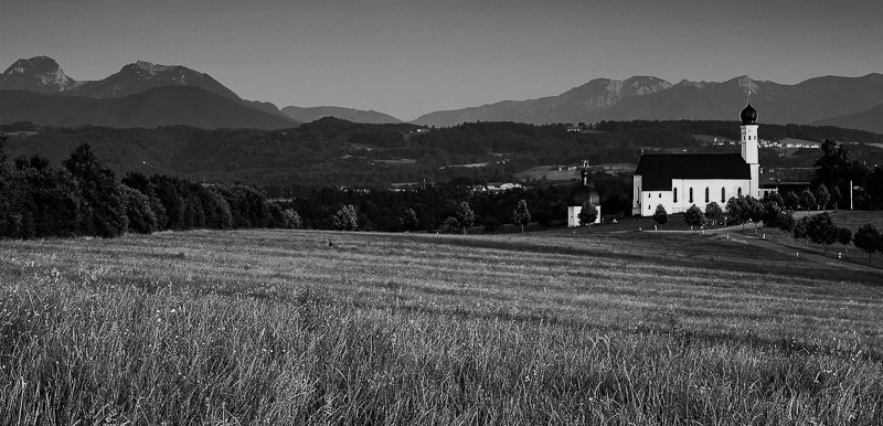 Ich denke allerdings, dass man das Bild besser machen könnte, indem man die Separation zwischen Vordergrund und Mitte verbessert. Das würde dem Bild viel mehr Tiefe geben. Im Moment klebt bzw. verschwindet das Dach der Kirche in dem Wald dahinter. Ganz ohne Kontrast. Du hast somit eigentlich nur zwei Ebenen: die Berge im Hintergrund und den ganzen dunklen Rest vorne.