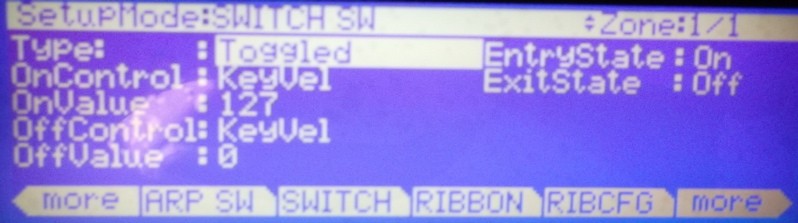 Beachte, wie hier ein beliebiger Controller, der ansonsten nicht gebraucht wird, hier im Beispiel der SW-Button, verwendet wird, um die KeyVel zu setzen. Damit der Controller nicht manuell ausgelöst werden muss, wird der EntryState auf On gesetzt, somit ist KeyVel gesetzt, sobald das Setup angewählt wird. Weiterhin wird der FT SW1 auf Momentary gesetzt und als OffController KeyNum mit dem Wert 0 gesetzt. D.h. wenn du auf den Fußschalter tritst, wird die Note 48 getriggert und gehalten, sobald du ihn loslässt, wird Note 0 getriggert (kein Sound) und Note 48 beendet.