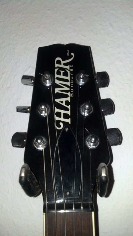 Die hatte auch noch Grover Mechaniken. Allerdings war dieser Schriftzug, wenn ich mich recht erinnere, in der gleichen Schriftart wie "Hamer" mittiger angebracht. Leider habe ich von dieser Gitarre nur ein kleines s/w Bild, auf dem fast nichts zu erkennen ist. Und mein "vintage - original - super - Hamer - T - Shirt", was es damals zur Gitarre dazu gab, hat nur ein "Hamer guitars" drauf.