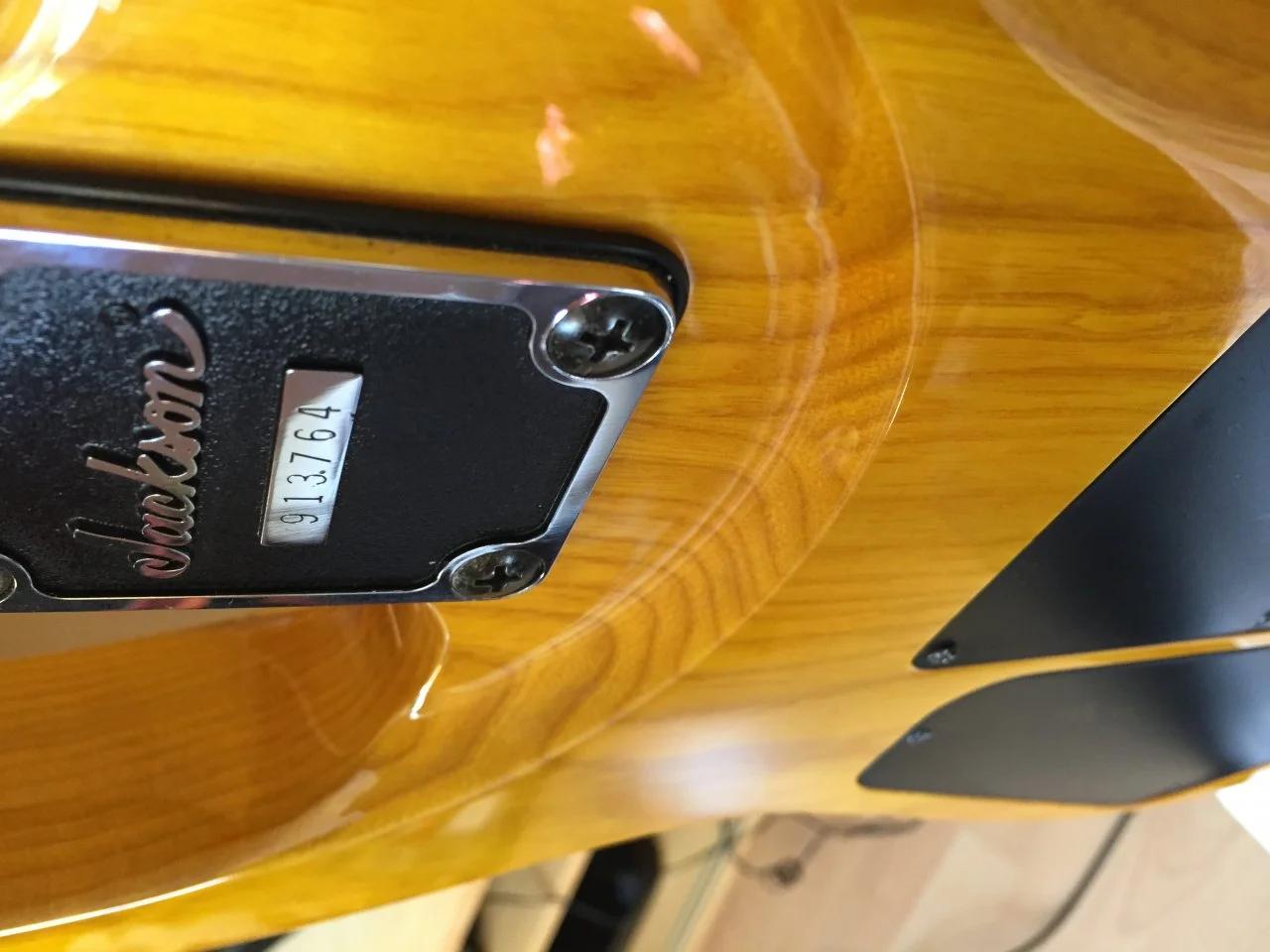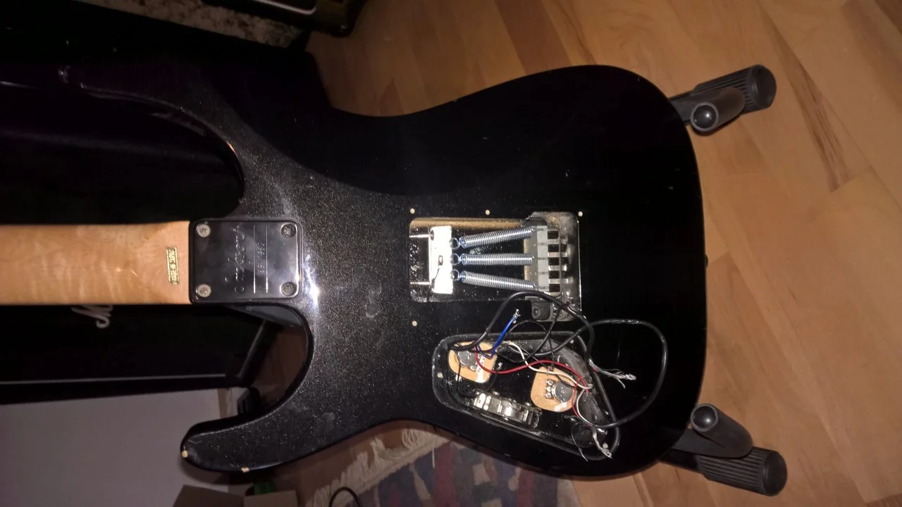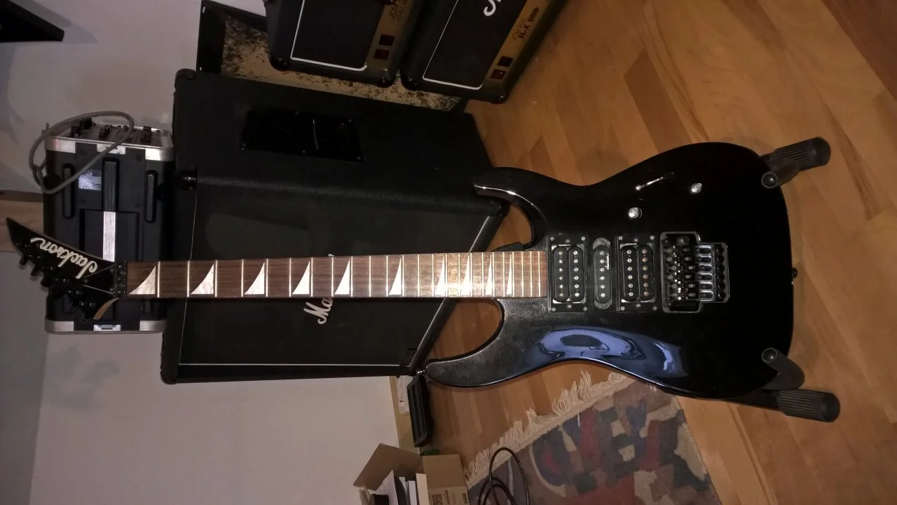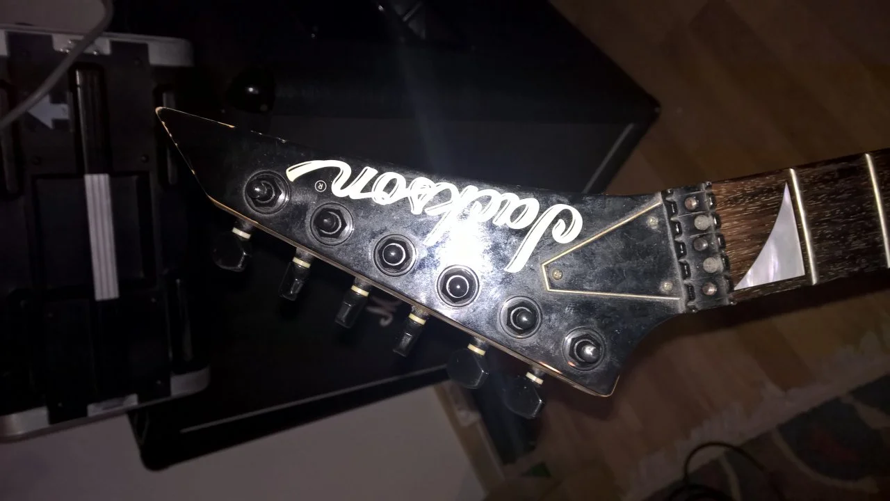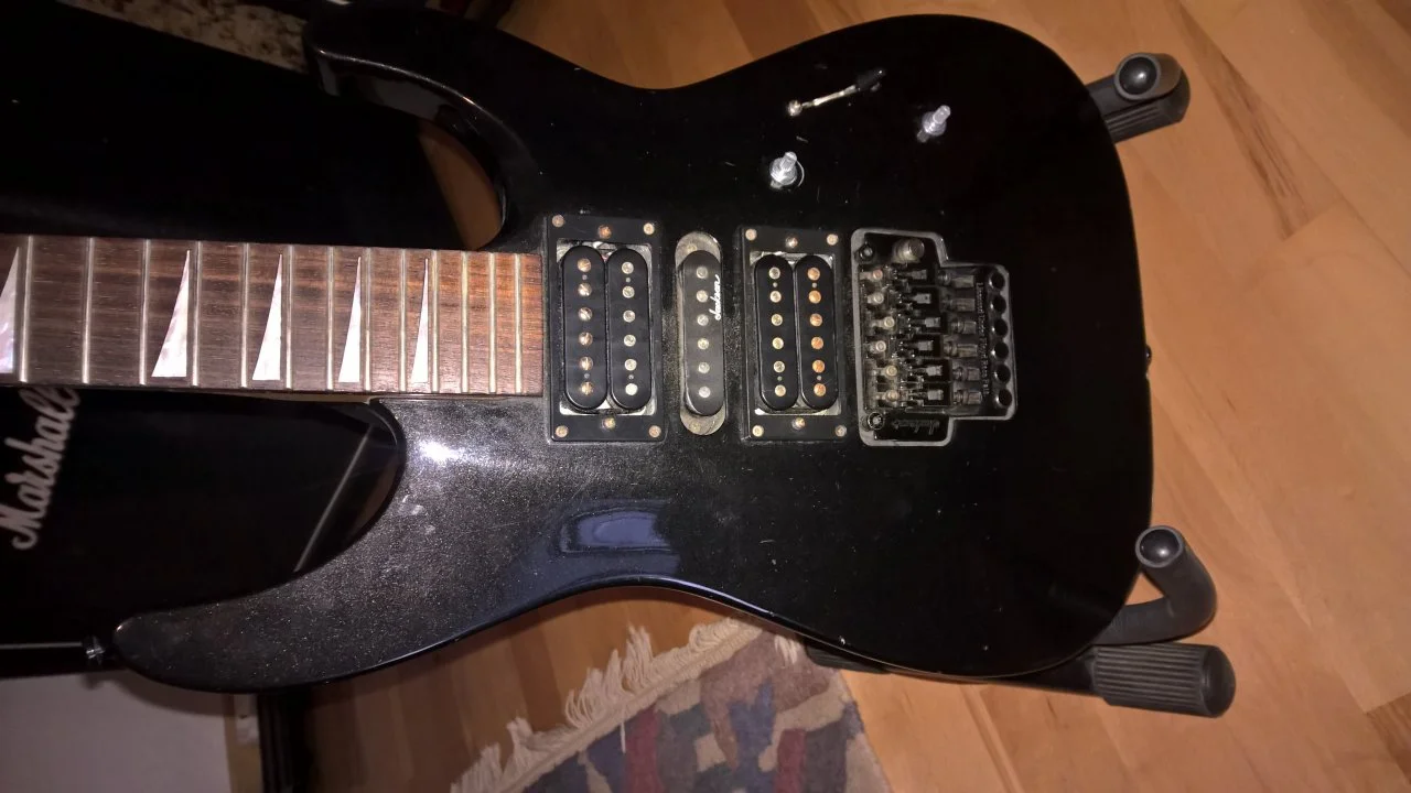 Man erkennt die gewölbte Decke nicht besonders gut. Der Zustand ist wie man sieht äußerlich nicht mehr unbedingt neuwertig. Außerdem muss die Elektronik jetzt erstmal neu verlötet werden, das mache ich wohl heute mittag. Das Floyd Rose ist auf jeden Fall eins von Jackson.