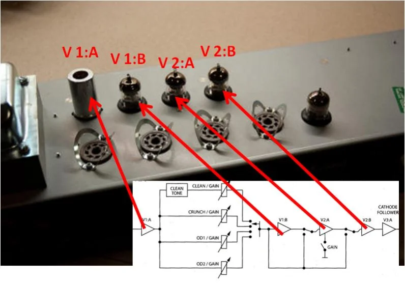 Ich habe anhand eines Bildes des Amp-Inneren und des Manuals mal versucht die Röhren-Bezeichnung aus dem Manual-Schaltplan denen im Bild zuzuordnen: (hoffe das klappt hier mit dem Bild)