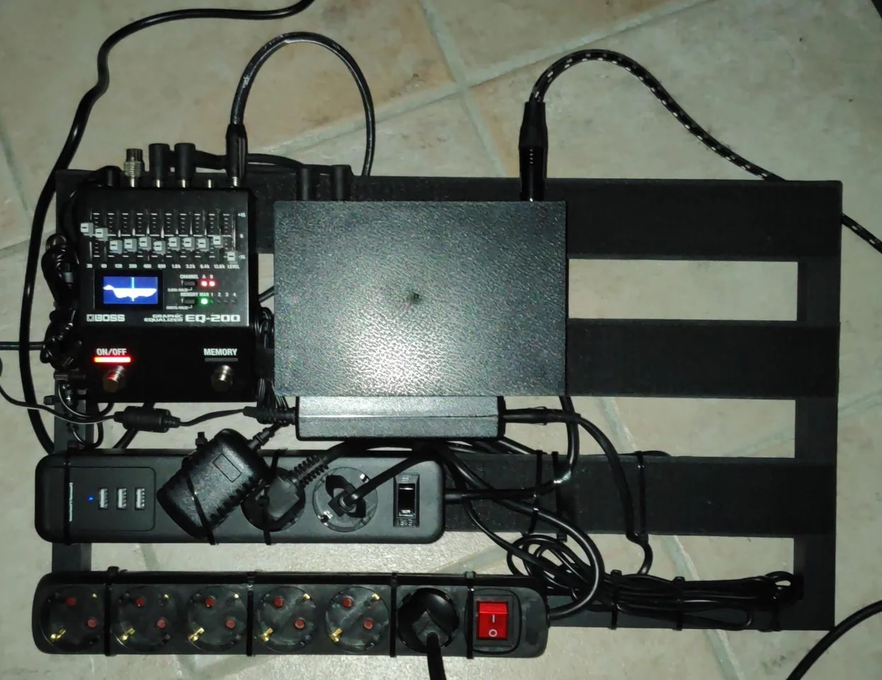 Um dem endlosenKabelgewirr aus Netzteil, Stromversorgung, Equalizer, Lineout - Verteiler eine Ende zu setzen habe ich mir ein Donner - Pedalboard zugelegt.
