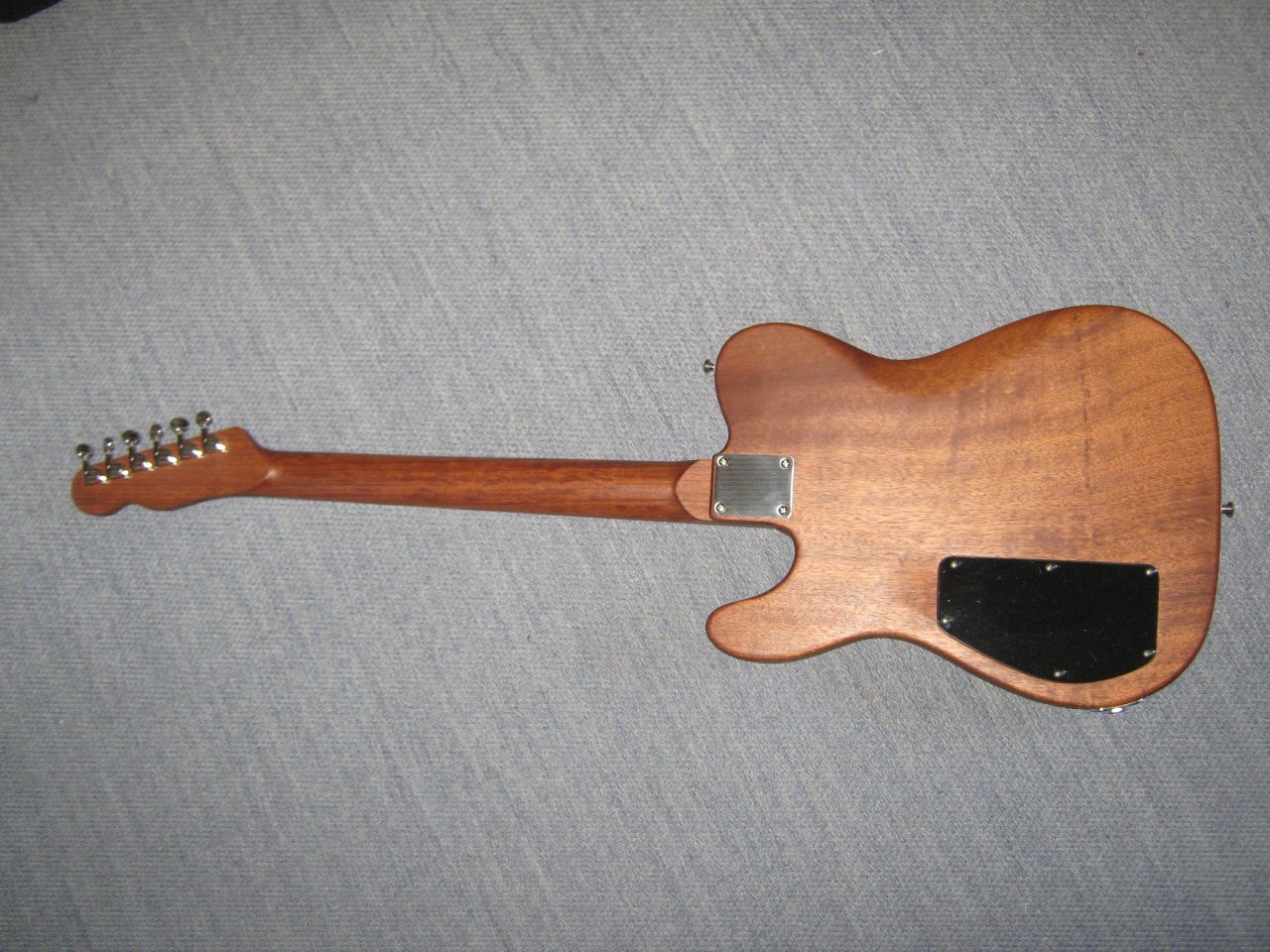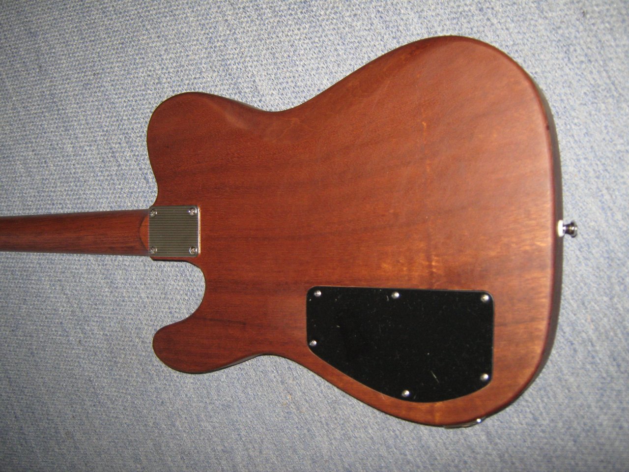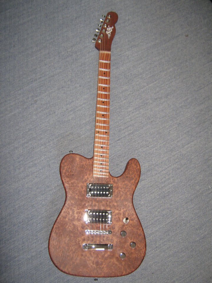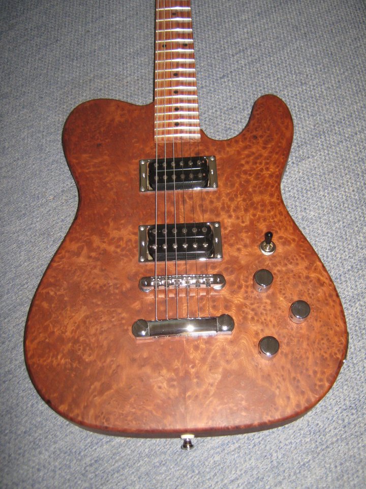 LP-Tele, weil Holz, PU's und Hardware einer LP entsprechen, bis auf die Form und Mensur. Der Korpus, aus sehr hartem Mahagoni, der trotz zweier Hohlkammern noch etwas auf die Waage bringt..Die Decke ist ein seltenes Holz aus fernen Landen. Thyria Burl. Der Hals ist aus Bubinga, mit einem Bahia Rosenholzgriffbrett. Bewaffnet ist das Teil mit einem Häussel (was denn sonst?) VIN+N am Hals, und einem Tozz B an der Bridge. Um die bezahlbar zu lassen, wurde bei der Decke nicht lackiert, sondern die komplette Gitarre mit einem Hartöl/Wachsfinish versehen. Die Brücke ist eine gut und günstig von Göldo. Wie auch die Kluson Mechaniken. Die Schaltung eher LP untypisch: Master Volume, Mastertone und ein Push/Pull für Split und