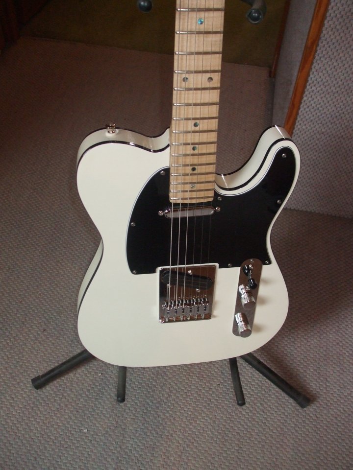 Perfekte Farbe, wunderschön, gerade mit dem weißen kleinen Pickguard.Heute hat sich mein Helferlein frei genommen (von seiner Freundin) und konnte mir helfen.. Die nächse auf der Warteliste ist fertig... Ein T-Modell aus Esche, mit Ahornhals. ABM Brücke und zwei Häussel PU's (Spezialanfertigung für den Hals) Mischung aus Alnico 5 und Alnico 3. Ein schönes Blau, finde ich?