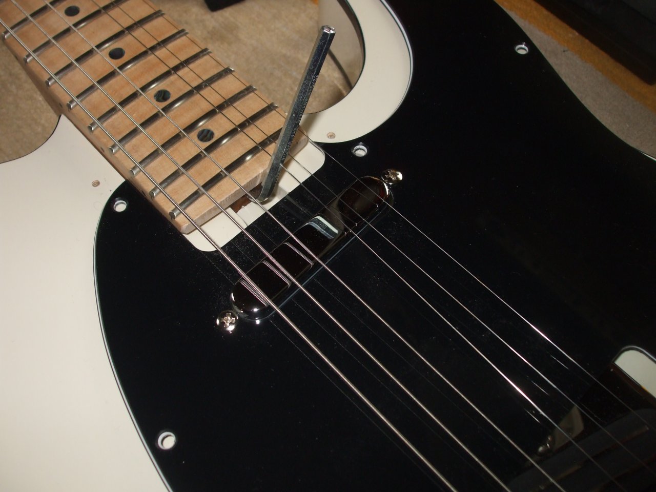 8 (ACHT!) Schrauben lösen, bevor man ran kann? Auch wenn es nicht häufig nötig ist, aber das wäre für mich der absolute Show-stopper bei einer Gitarre. EBMM hat das industriell so schön gelöst und mittlerweile ziehen auf Grund der hohen Praxistauglichkeit so viele nach. Es will mir nicht in den Kopf, warum man das heute noch so unelegant möchte. Aber Geschmäcker sind verschieden. Dem Kunden muss es gefallen und er ist der Einzige, der zählt.So, mühsam nährt sich das Eichhörnchen... oder so ähnlich.. Die 3. von 12 Rückständen ist fertig. Tele Modell, Korpus selektierte Erle, Hals und Griffbrett Vogelaugenahorn. Mechaniken Kluson Backlocks. Tonabnehmer Häussel Custom RBC. Standard Hals PU und Klinge Hot an der Brücke. Auf Kundenwunsch keine ABM Brücke, sondern Gotoh Brücke mit Einzelreitern. Farbe weiß mit Doppelbinding. Und ein Bild, wie der Halsstab am Halsfuß erreichbar ist: Die Hals PU Fräsung etwas größer, Schlagbrett lösen, anheben, nach hinten schieben... und mit dem Inbus einstellen.