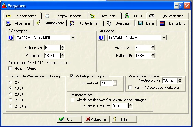 ich möchte mein Kurzweil-PC3LE8-Synthesizer digital am PC aufnehmen. Dazu verwende ich ein Tascam-AI "US-122 MKII/US-144 MKII Control Panel", ein digitales Übertragungskabel "Cable 75 Ohm CDS 122" (5 Meter lang) und WaveLab 3.0 unter Windows XP. Ich gewinne auch ein digitales Aufnahme-Signal, allerdings ist es extrem leise und klingt dennoch übersteuert. Ich habe alle Einstellungen (Bitauflösung, Samplerate) nach bestem Gewissen vorgenommen (siehe Anhänge). Die Lautstärkeregler des Kurzweils und des Tascams sind (sowohl physisch als auch unter Windows) alle auf Maximum gestellt (vermutlich kommt daher die Übersteuerung).