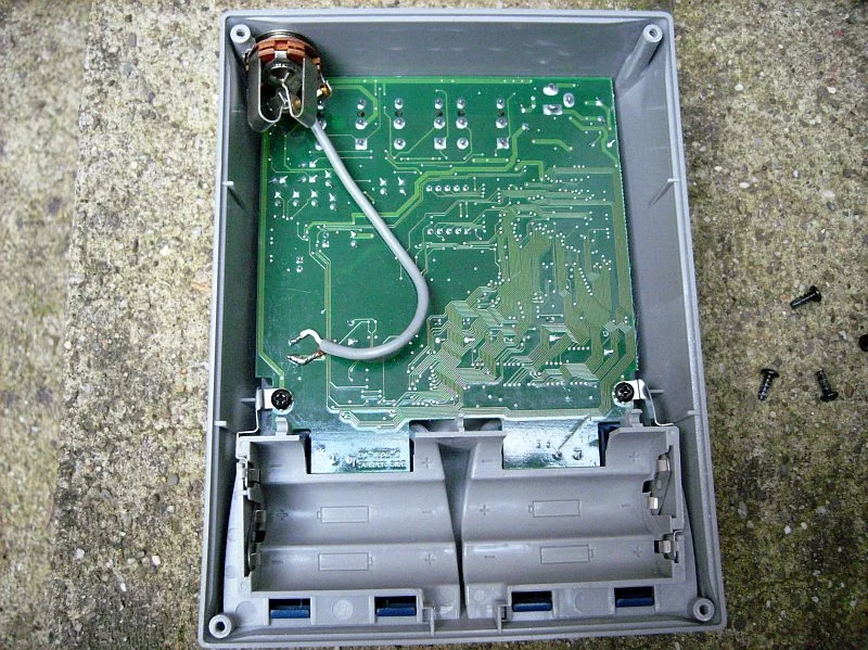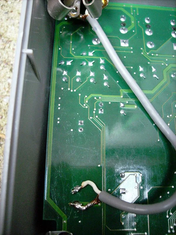 Mit einem vergleichswise einfachen Eingriff ins Gerät ist ein Fußschalter-Anschluß allerdings problemlos nachrüstbar. Dazu werden die vier kleinen Schrauben herausgedreht, die die metallene Bodenplatte festhalten, die dann abgenommen werden kann und den Blick auf die Lötseite der Platine freigibt. Genau unter dem frontseitigen Taster liegen die beiden Lötpunkte, die bei Betätigung des Tasters verbunden werden. Lötet man hier ein zweiadriges Kabel an und verlängert dies zu einer Klinkenbuchse, die noch bequem ins Gehäuse passt, läßt sich an dieser Buchse ein normaler Fußtaster anschließen, wie er zB. von Boss, Behringer oder Bespeco angeboten wird.