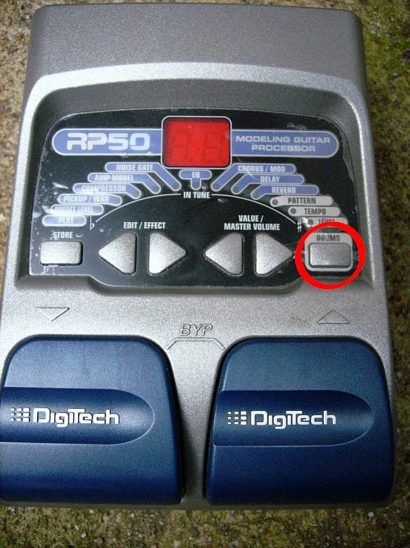 Der im RP50/RP80 eingebaute Drumcomputer ist zwar nicht mit eigens für diesen Zweck hergestellten Rhythmus-Geräten zu vergleichen, zum jammen oder für kleinere Aufführungen mit einfachem Anspruch an die Drums reicht er aber allemal. Ein großer Nachteil ist dabei, daß man die Drums nicht über einen Fußschalter starten und stoppen kann, sondern nur über einen winzigen Taster auf der Frontseite, für den sich der Gitarrist bücken muß, denn dieser Taster ist auch nicht per Fuß bedienbar.