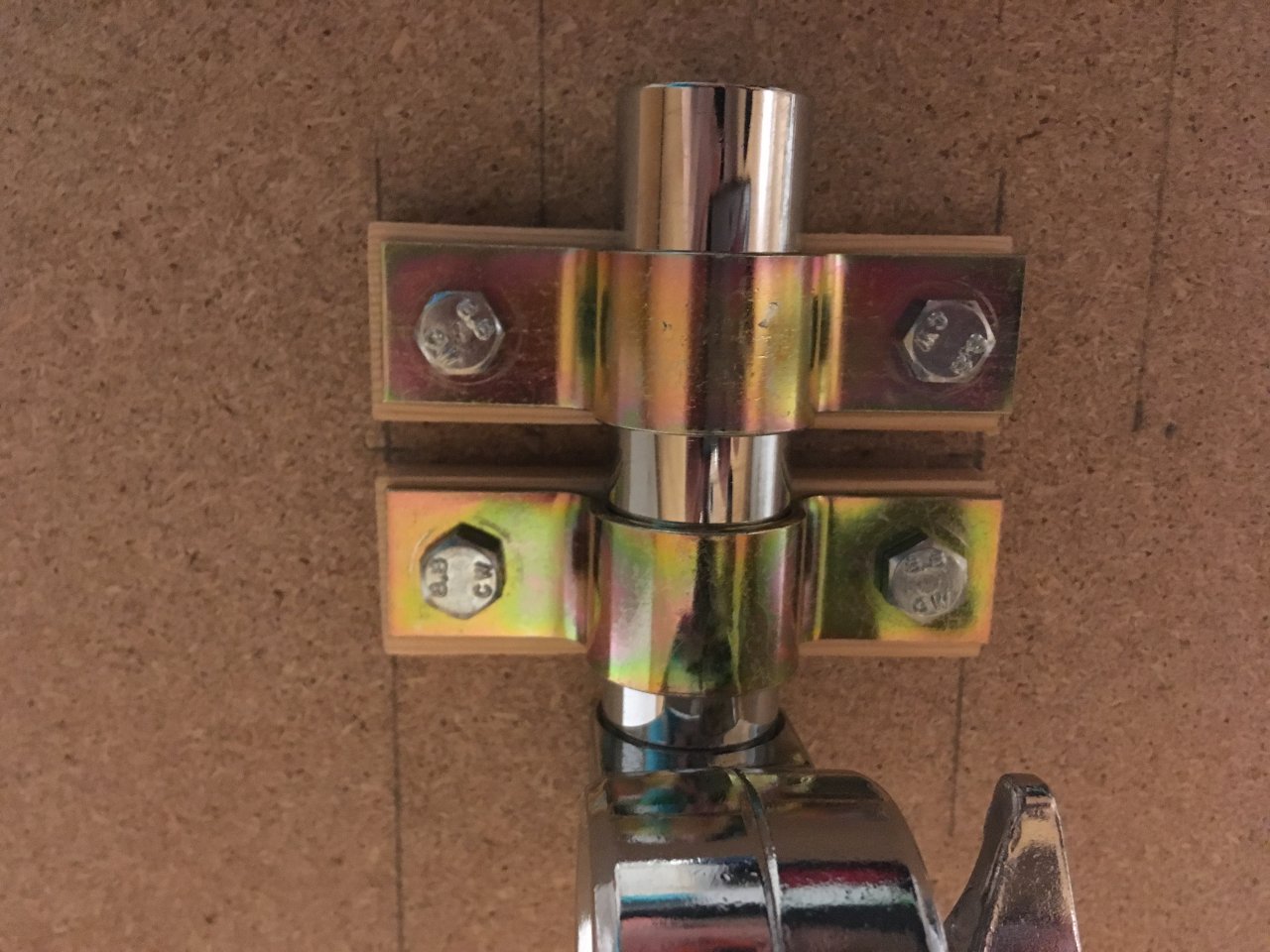 Der Tisch sollte auf einer Tomhalterung (Model Pearl) befestigt werden. HierfĂŒr habe ich zwei Schellen auf die Platte geschraubt und dabei (spĂ€ter) eine FlĂŒgelschraube verwendet, damit alles abnehmbar und justierbar bleibt.