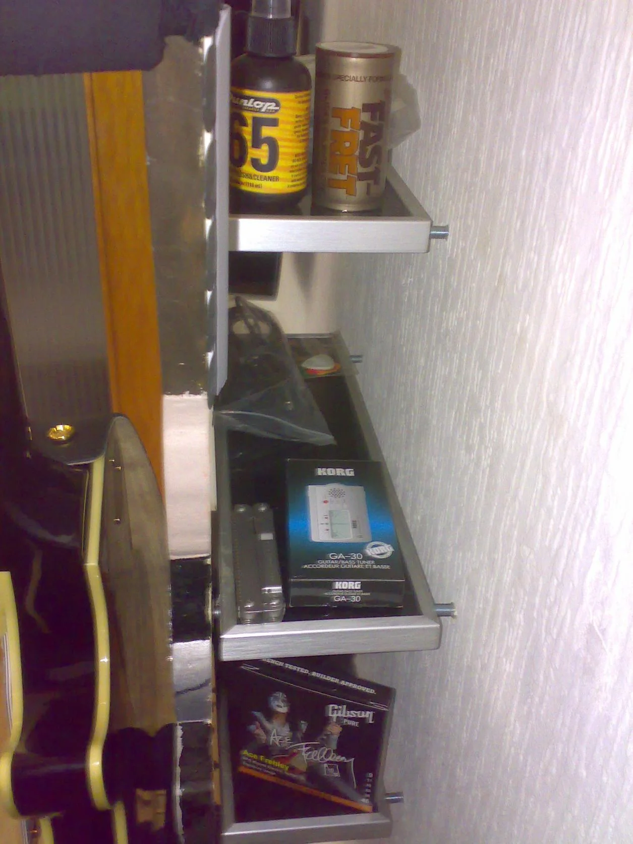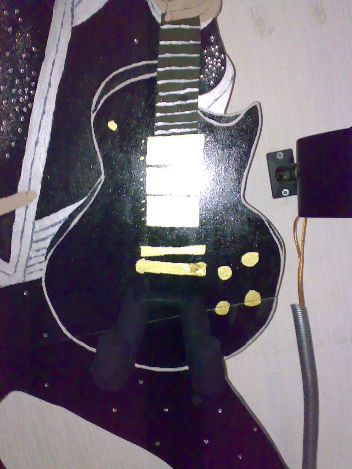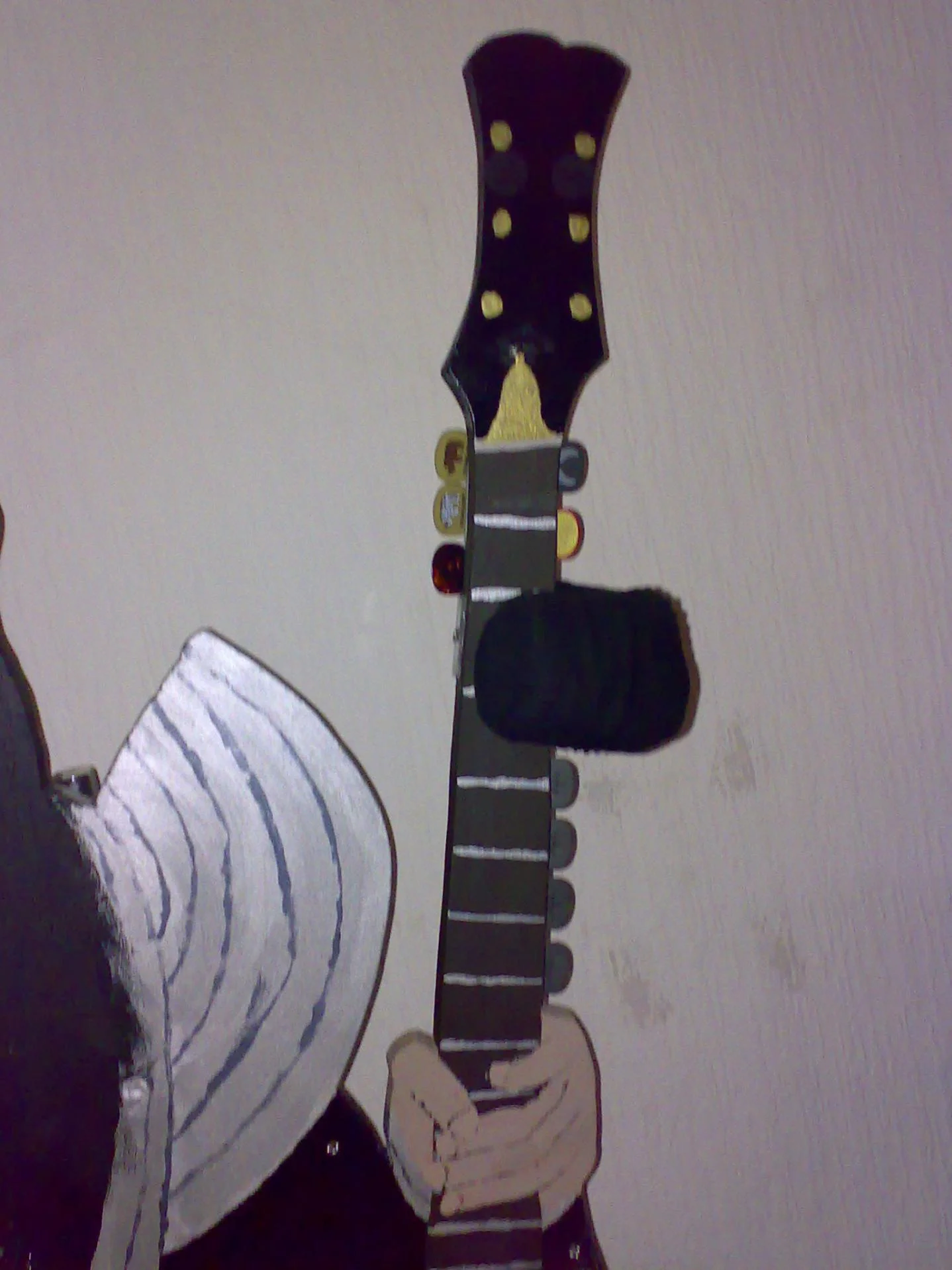 Da Gitarren normalerweise nicht schweben können, hab ich mir aus dem Baumarkt für unten nen Haltebügel und für oben ein Flacheisen besorgt, zurechtgebogen, als Polsterung Schaumstoff für Heizungsrohre drumgeklebt und das Ganze zur Zierde noch mit Stoff umwickelt.