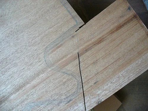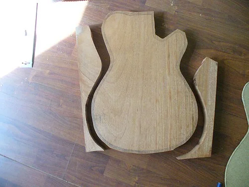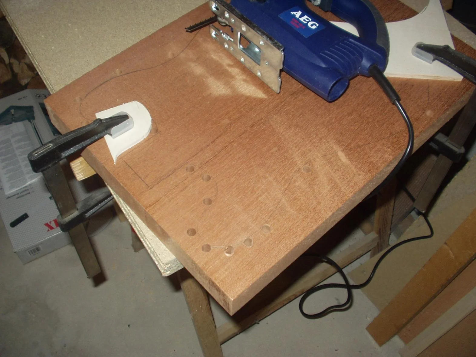 Bevor ich den Korpus ausgesägt habe, bin ich zu einer in einer Jugendwerkstatt die ungefähr 100 Meter von unserer Wohnung entfernt liegt und hab den Mahagoni-Block von 52mm Dicke auf 48 mm hobeln lassen. Super freundliche Leute dort, sie haben es für lau gemacht, dafür musste ich ihnen aber versprechen die Gitarre, wenn sie fertig ist, vorbeizubringen. Dann habe ich (entgegen meinen Arbeitsplan am Thread-Anfang) die Form direkt vom Ausdruck per Bleistift auf den Block übertragen und angefangen zu sägen. Alter Schwede, das war ein Kampf wie David gegen Goliath und ich war leider David mit der kleinen Stichsäge