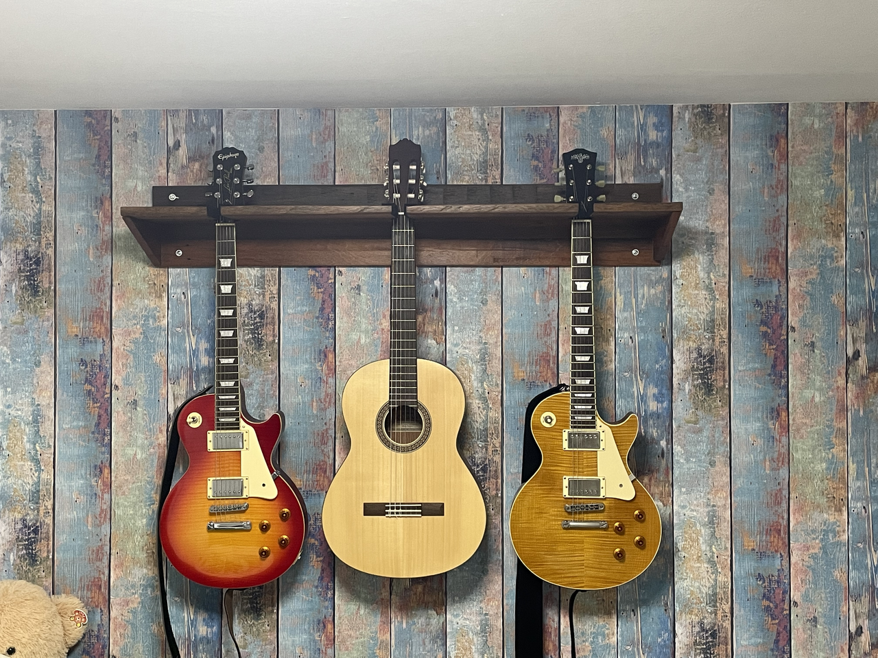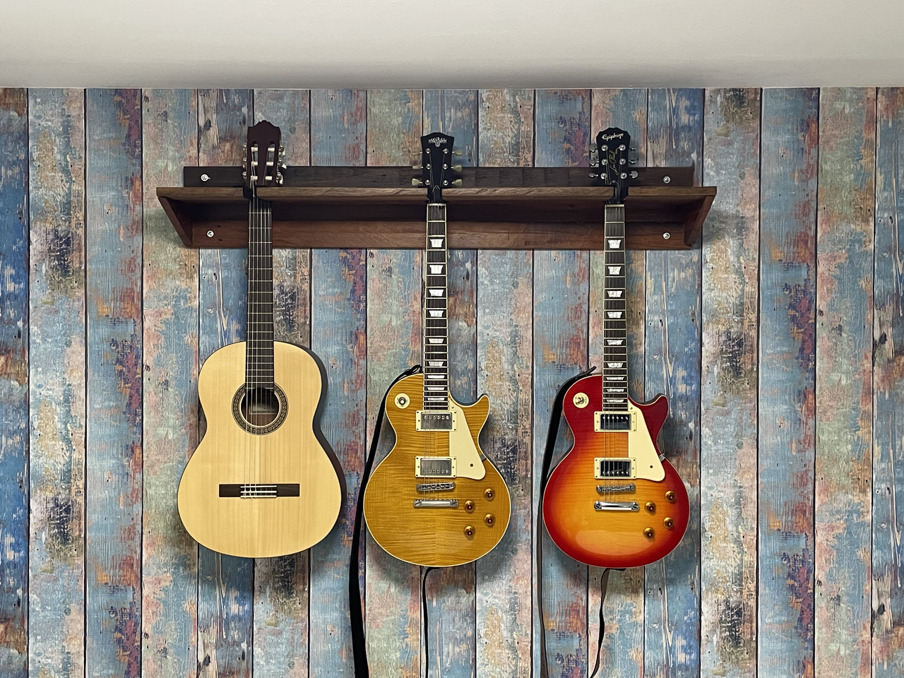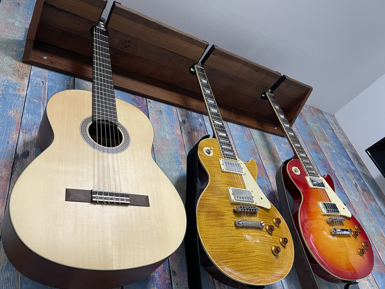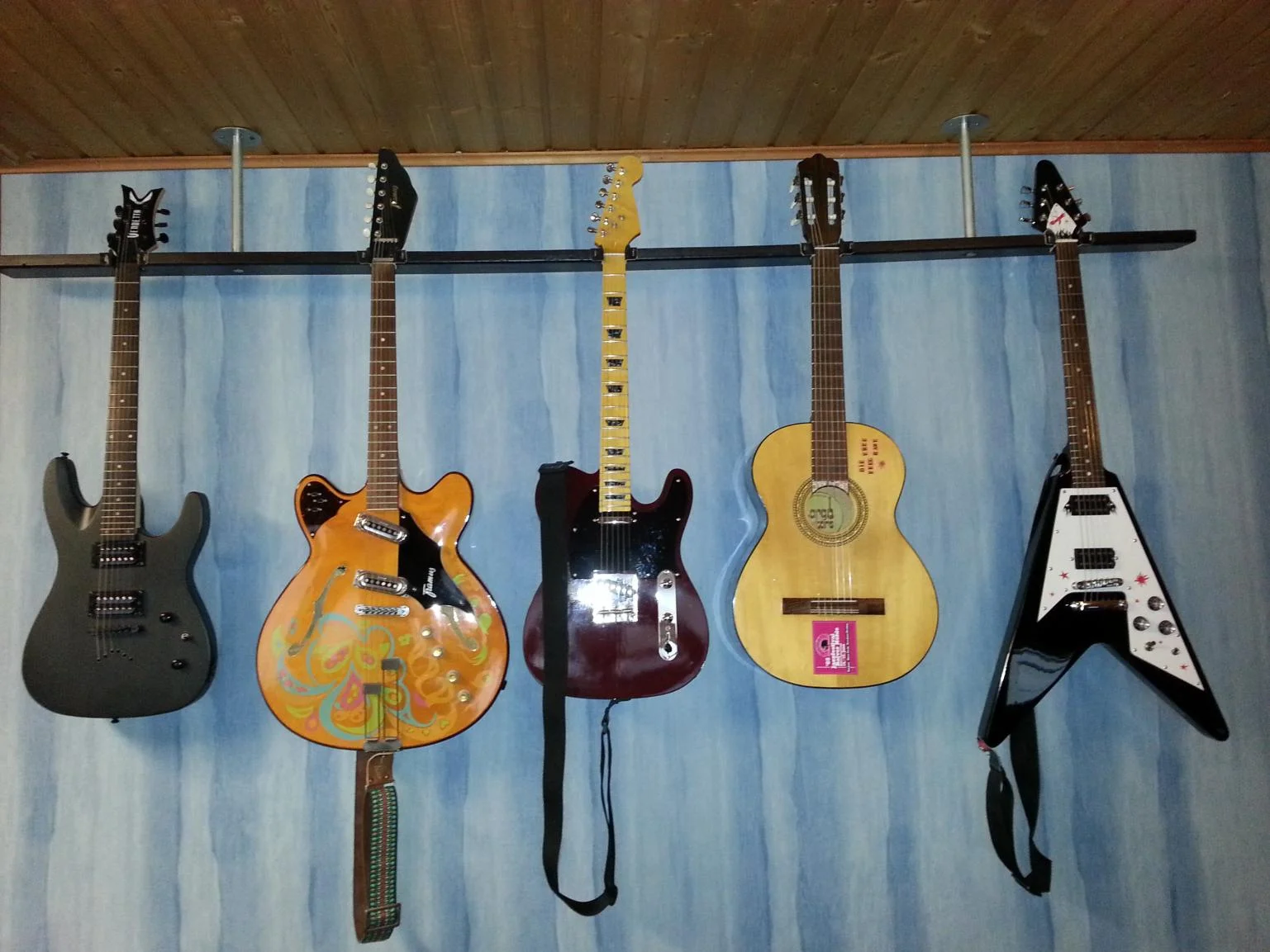 Also frisch ans Werk: Was brauche ich für sieben von insgesamt neun Klampfen, von denen ja zwei immer in der Nähe meines Pults stehen (Einspielen, Ideen - einfach griffbereit) ? Mit anderen Worten, was benötige ich, um sieben Gitarren nebeneinander auf 2,50m Länge verteilt an die Wand zu "pappen"