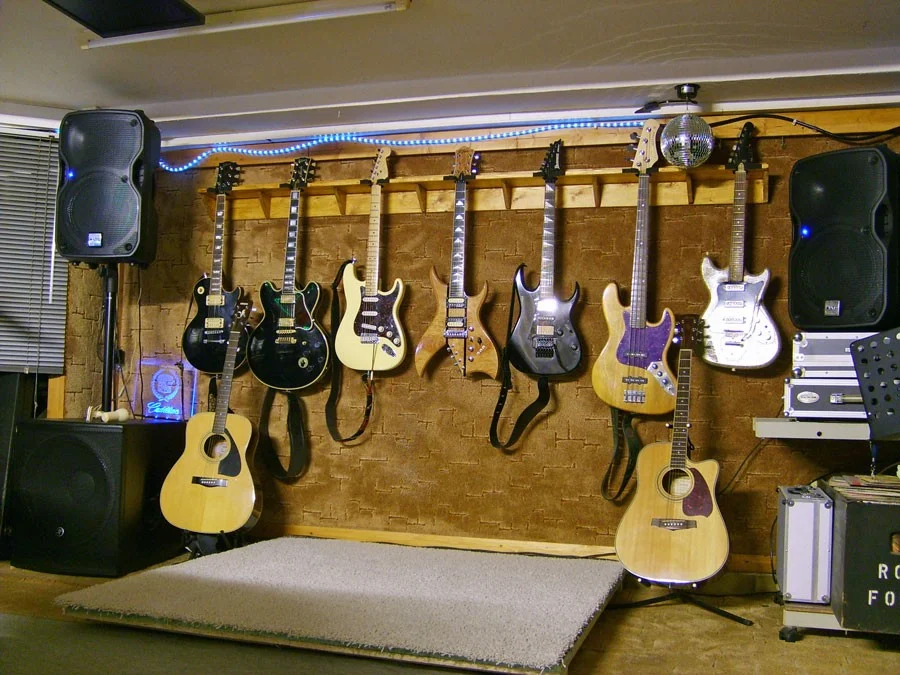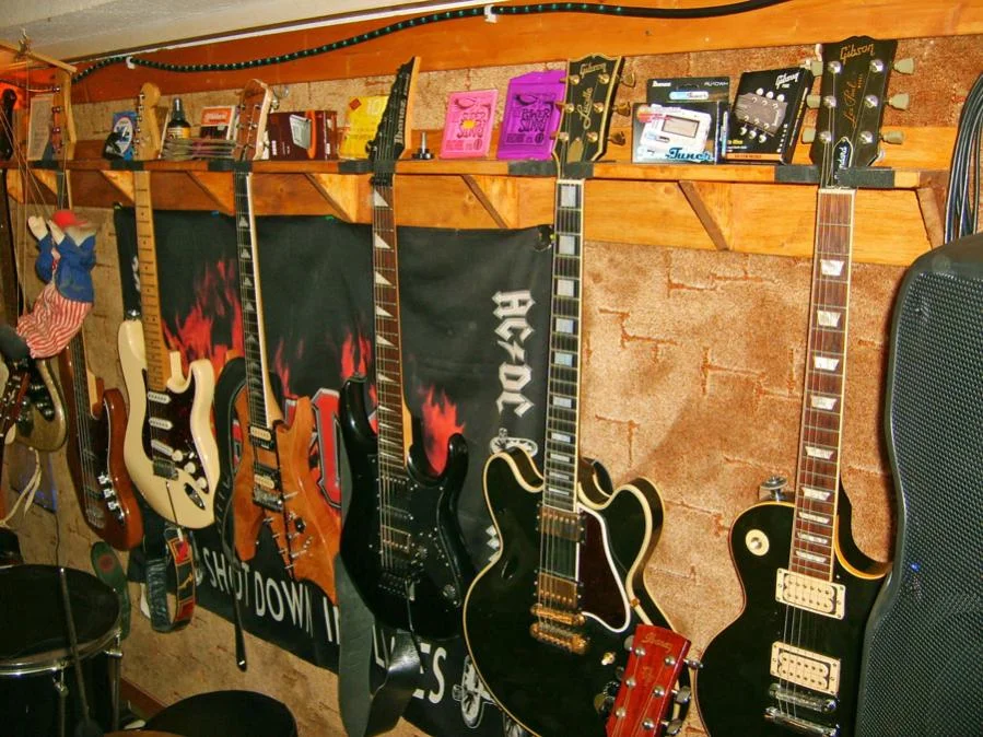 Die Wand hinter dem Drum-Kit bot sich als Gittenaufbewahrungsplatz an: Teppichbehang (schont die Klampfenrückseite), ein paar Fahnen weniger tun's auch, neuer Blickfang beim Betreten des Raumes motiviert neu usw. usw.