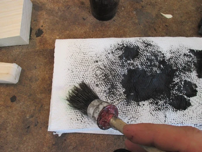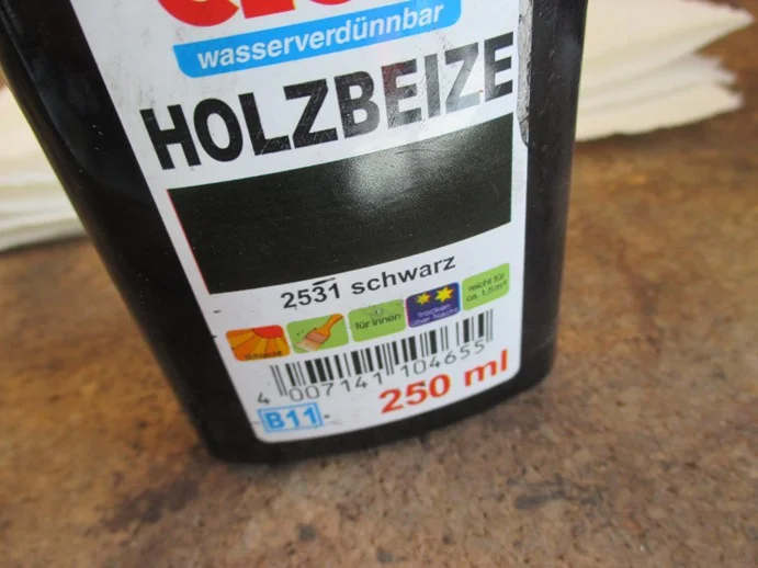 Dann brauchen wir eine Kontrastfarbe. Weil das Holz nicht lackiert ist und ich es hier besonders deutlich zeigen möchte, nehme ich schwarze Beize. Der Kontrast ist für eine praktische Anwendung allerdings viel zu groß - in der Praxis arbeitet man selten mit solch harten Farbunterschieden, sondern tastet sich mit hellen Tönen langsam dunkler werdend an das Ergebnis heran.