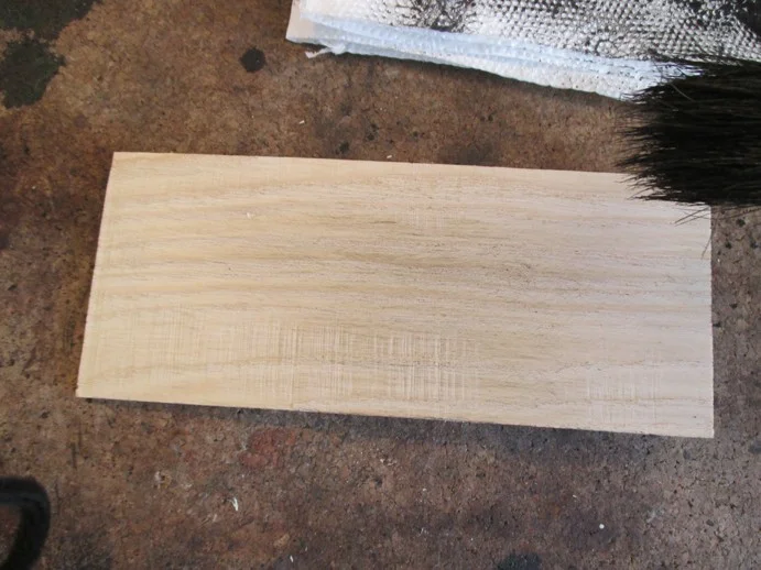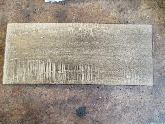 Wenn man das ganze dann fort führt, werden langsam die erhabenen Stellen betont, die tiefer liegenden Stellen verbleiben in der Basisfarbe. Das augenscheinlich glatte Brettchen zeigt nun deutlich seine Furchen und Kerben von der groben Bearbeitung. Hier liegt auch das größte Problem der Trockenbürsttechnik.... sie betont gnadenlos die feinsten Risse, Kratzer. Bei Agingprojekten ist genau das der gewünschte Effekt, wenn man ihn mit dem Reliefschliff kombiniert. Bei anderen Arbeiten ist eine absolut perfekt feingeschliffene Oberfläche Grundvoraussetzung.