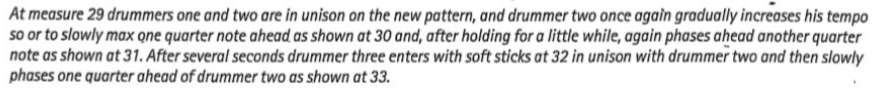 Vier Sätze unterscheiden sich nur minimal, d.h. durch die Klangfarbe, nicht? Diese Sätze bestehen ja aus den notierten Patterns..es ist ja so, das ein kleiner Text erläutert, was bis zum nächsten Pattern geschehen soll (s. oben Spielanweisung: Übergang Pattern 29-33)…welcher akustischer Effekt ergibt sich? Hat das denn überhaupt eine Auswirkung? Ich verstehe das nicht ganz..