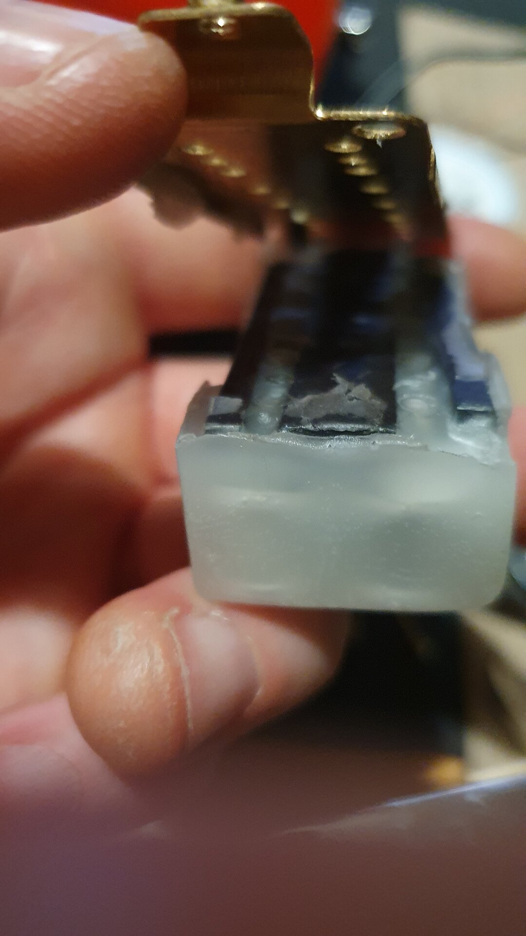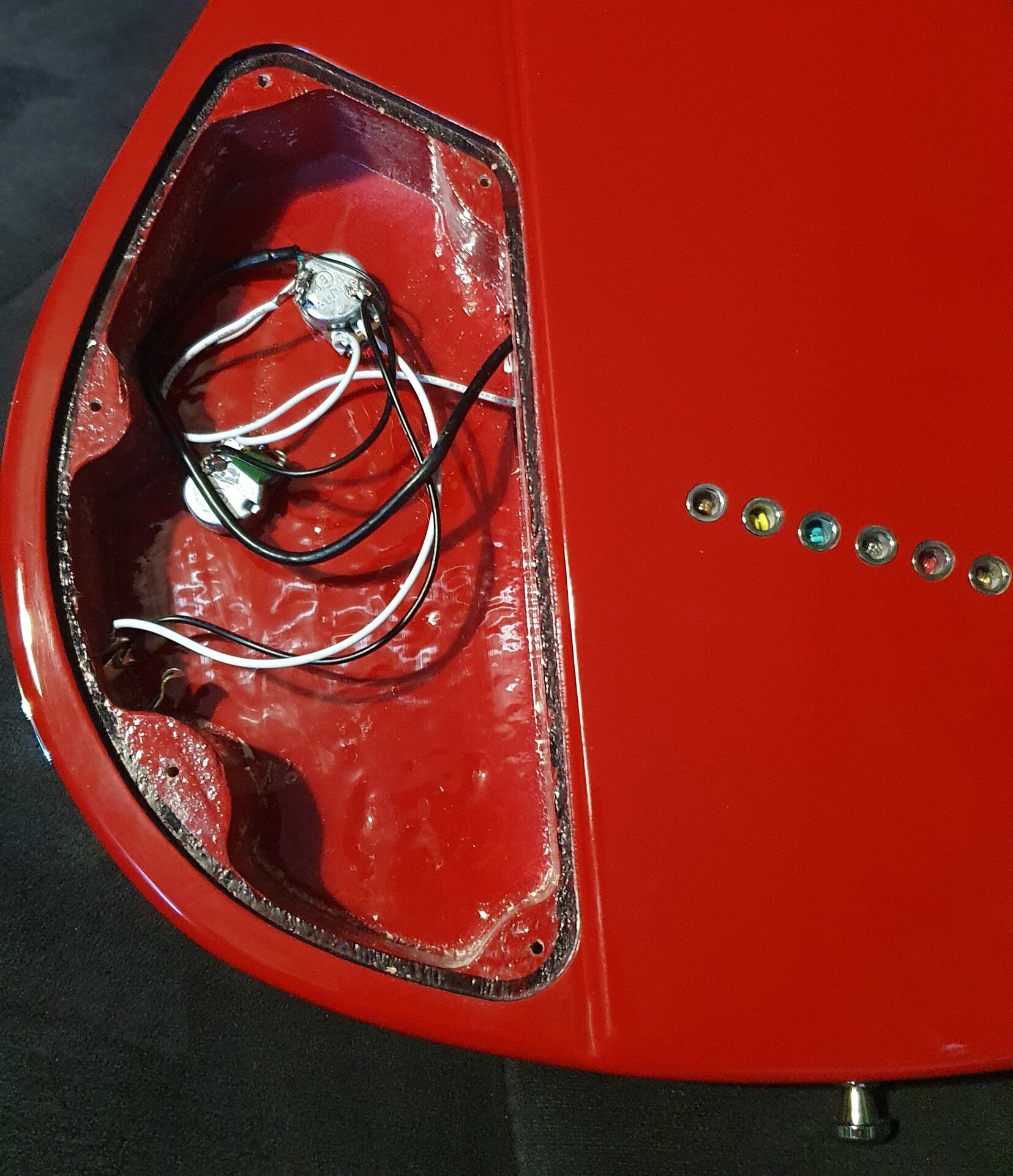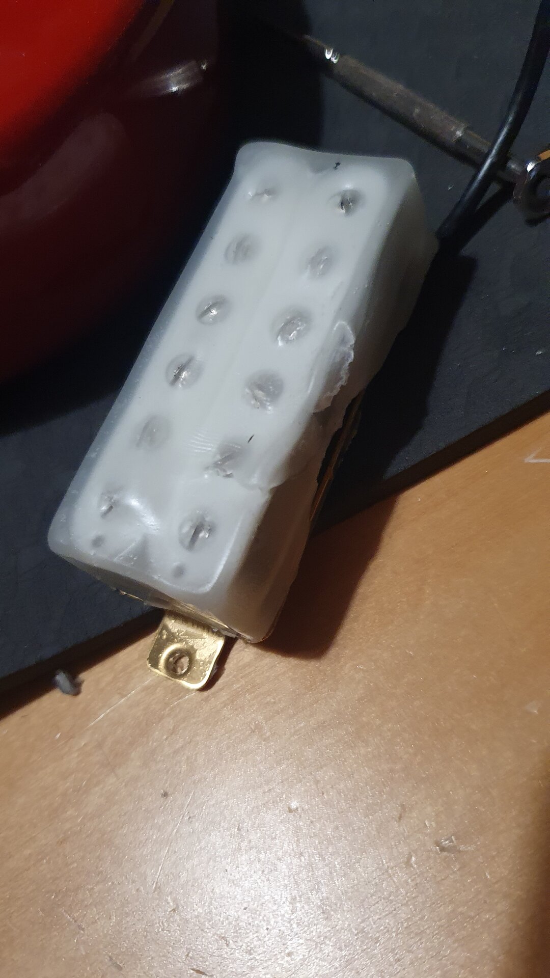 Die Potis sind Minipotis. Das Volumenpoti ist recht gleichmäßig im Regelweg, beim Tonpoti passiert eher im letzten Viertel was. Der Pickup ist nicht etwa ein echter Firebirdpickup (je ein Klingenmagnet, von Draht umwickelt als Humbucker verlötet) sondern eine Art Minihumbucker (Metallpolepieces, hier wahrscheinlich von Keramikmagneten auf der Unterseite magnetisiert). Woher ich das weiß? Ich habe ihn mal geöffnet, da ich ihn eh wachsen wollte. Ich fand dann heraus, dass er schon gewachst war. Ich habe ihn dann wieder zugelötet und nochmal gewachst. Warum? Dazu kommen wir gleich.