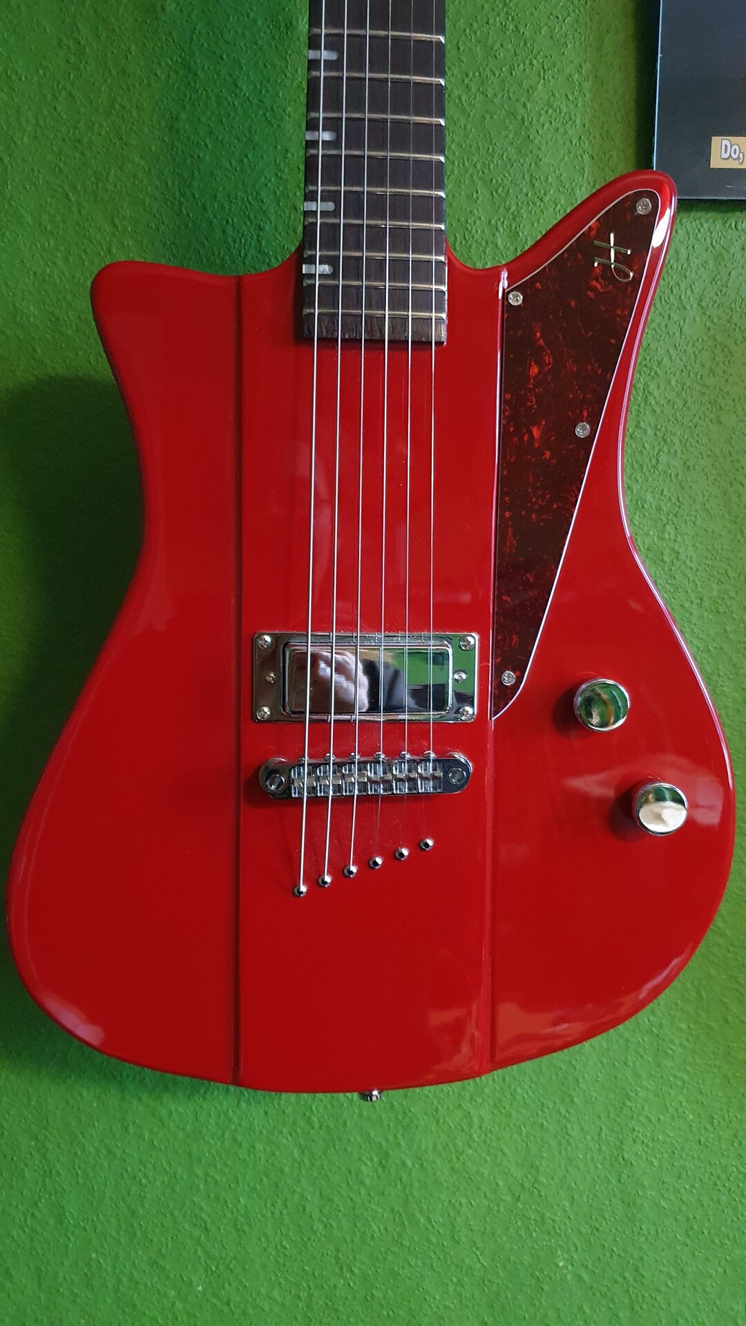 Durch das geringe Gewicht und eben diese kleinen Korpusmaße fühlt sie sich manchmal fast wie ein Spielzeug an. Dann andererseits wieder nicht, weil der Hals kräftig ist und echt nicht „wabbelt“. Auch durch meine eigenen Verbesserungen hinsichtlich Halskrümmung/Brückenhöhe/Bundabrichtung ist sie sehr angenehm spielbar. Konstruktionsbedingt ist die Bespielbarkeit bis zum 19. Bund problemlos, danach muss man sich etwas verrenken. Mittlerweile habe ich den vorderen Gurtpin (eh beide gegen schallerkompatible ausgetauscht) vom oberen „Korpushorn“ an den Halsfuß verlegt. Dann hängt sie für mich schöner