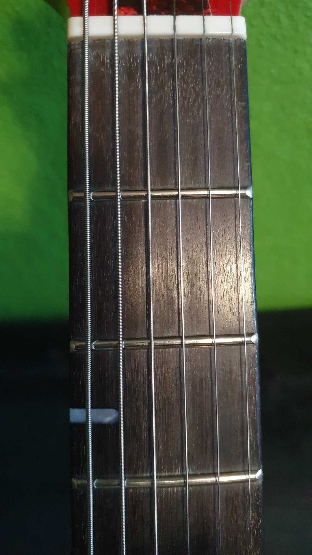 Griffbrett: Ebenholz (laut Support könnte es auch Palisander oder [gerösteter?] Ahorn sein, da gab es widersprüchliche Angaben), 22 Bünde
