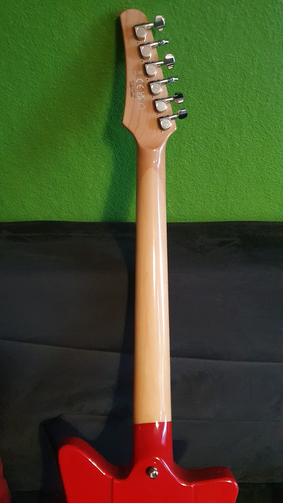 Direkt kaufen wollte ich eh nicht, wegen Zugreise und so entschied ich mich im August 2025, ein Exemplar zu bestellen und auf bessere Verarbeitung zu hoffen. Das Instrument, was mich erreichte, die Variante in „Savannah Shade Blue“ war auch besser als im Showroom, aber in der Fabrik wurde der Erdungsdraht von Steg zu Elektrik vergessen. Bevor ich da selber an der Einschlagbuchse der Brücke zerre, um da so eine Verbindung zu schaffen, habe ich mich mit dem Kundendienst in Verbindung gesetzt, um die Gitarre umzutauschen. Zusätzlicher Nebeneffekt: Ich konnte sie nun in „Mesa Sunset Red“ bestellen. Ich schwankte sehr zwischen diesen beiden Farben und als ich die Gitarre in "Babyblau“ vor mir hatte fehlte mir das Besondere, denn ich habe schon eine Harley Benton DC in Ferris Blue, einem sehr ähnlichen Farbton. Deswegen nun Rot, was irgendwie Hot-Rod-mäßig aussieht, wie ich finde.