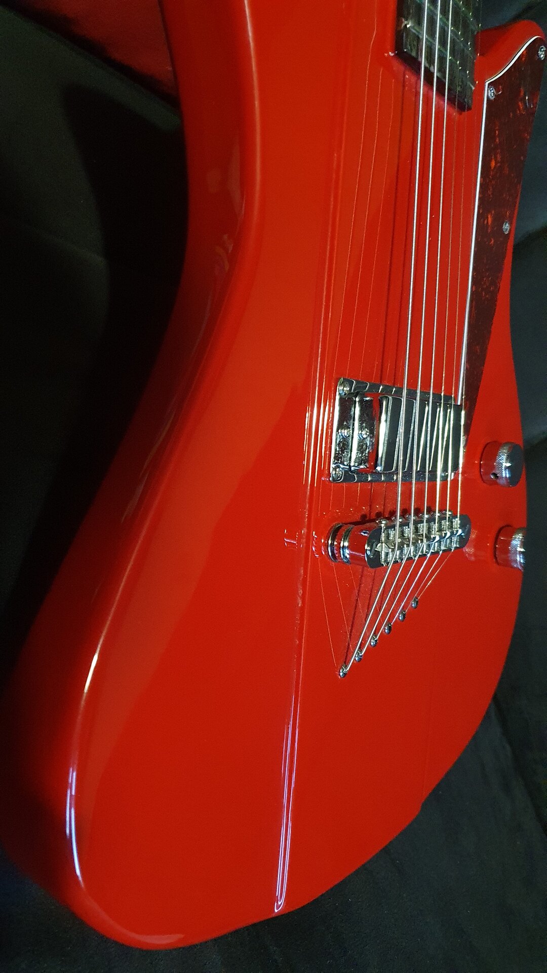Die ist wirklich mal was Anderes, obwohl an Firebird angelehnt! Der Korpus ist allerdings viel kleiner! Er hat wie eine Firebird eine abgestufte Erhebung, aber wohl nicht so wie die meisten Gibsonmodelle mit angeklebten Korpusflügeln, sondern einfach so gefräst. Eigentlich ähnlich der aktuellen Gibson Firebird Platypus. An den Seiten ist der Korpus 39 mm dick (hat allerdings rückwärtig eine Bierbauchfräsung), mittig 44 mm.