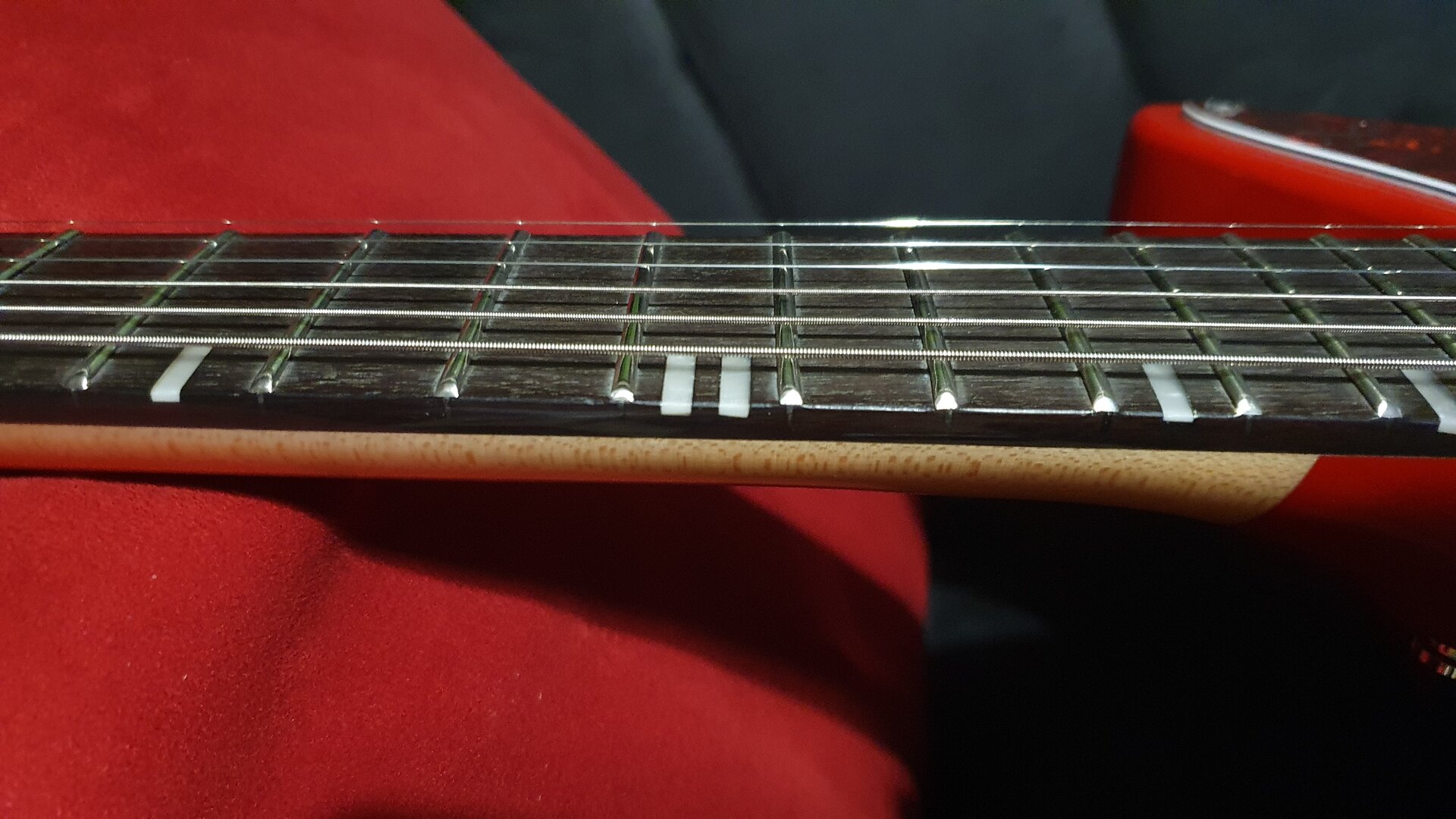 Nicht schlecht! Die Bundenden sind perfekt verrundet. Die Lackierung, wo Rot an Natur angrenzt ist lediglich an der Kopfplatte leicht unsauber und am Halsansatz ganz leicht schief. Das stört mich aber nicht und ich finde diese Lackieridee ziemlich cool. Ich habe aber auch schon Modellvarianten gesehen, wo es für mich noch einmal schöner aussah, aber vielleicht ist das auch nur Serienstreuung. Manche Saitenhülsen auf der Rückseite können beim Saitenwechsel rausfallen. Die Bundabrichtung hätte etwas besser sein können, so dass bei 2mm Saitenlage (tief E im 12. Bund) auf manchen Bünden (an manchen Stellen) leichte Deadspots vorhanden sind. Ich habe manches schon durch Einzelbundabrichtung etwas behoben.