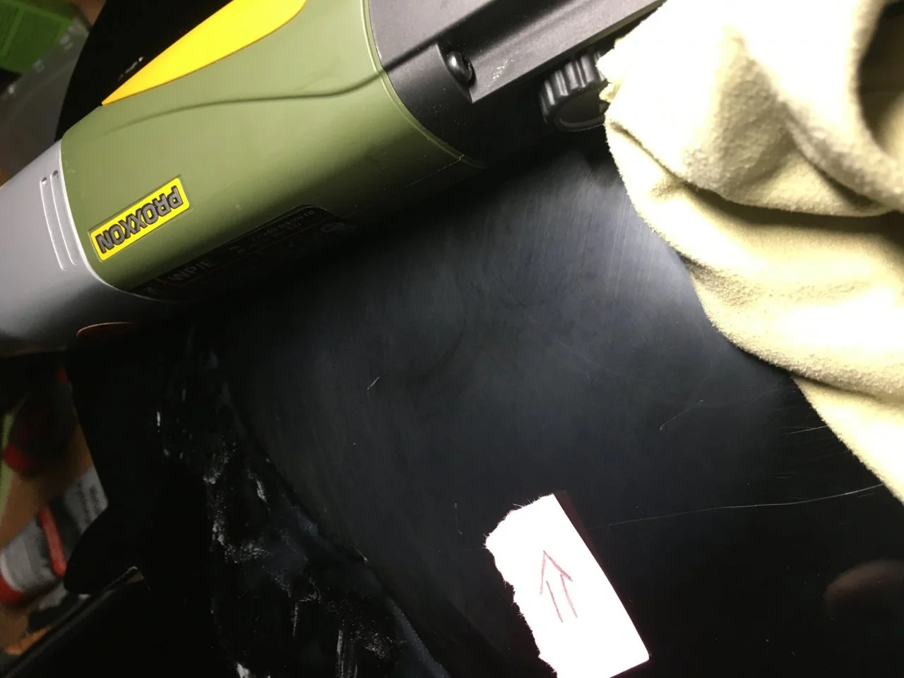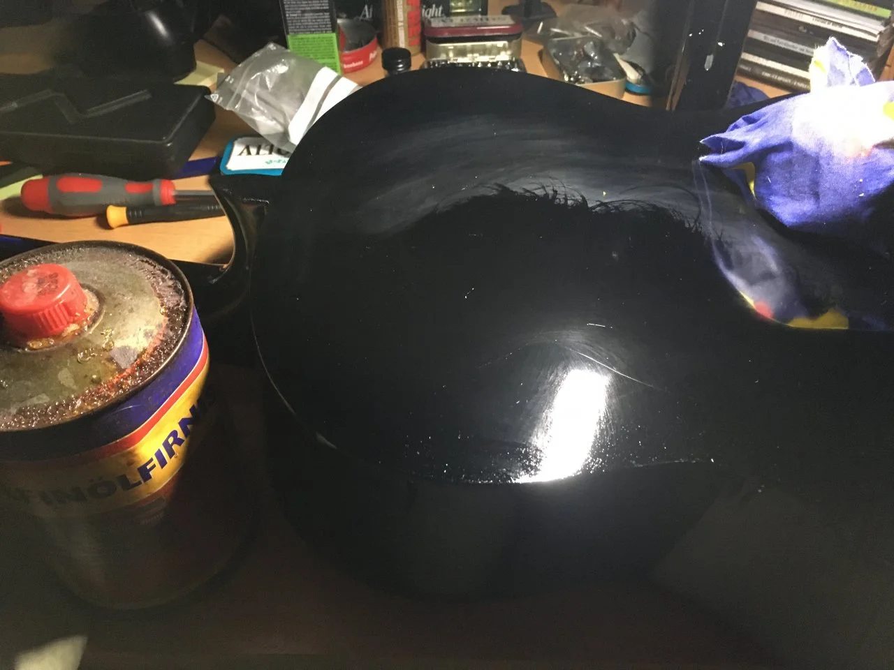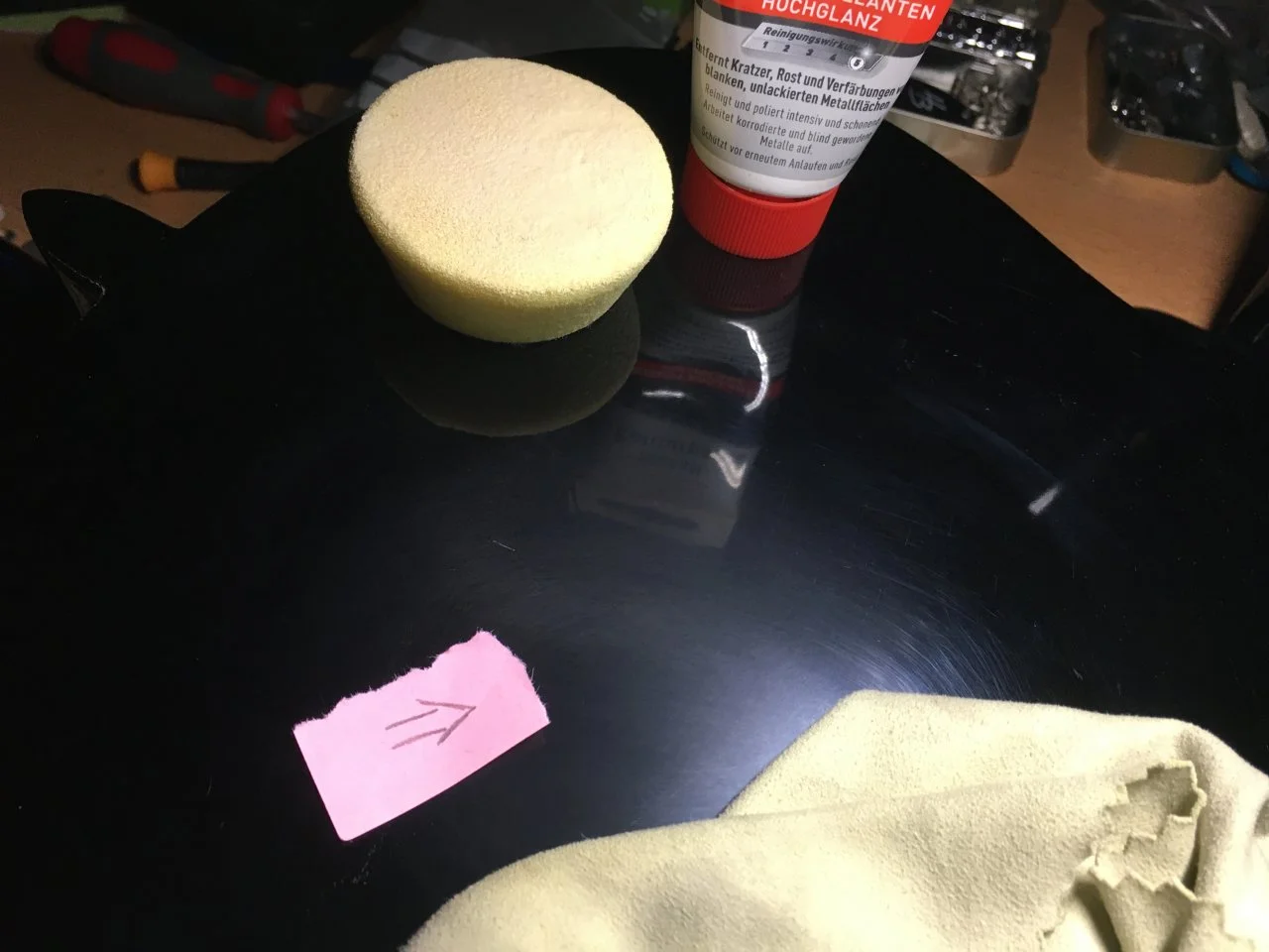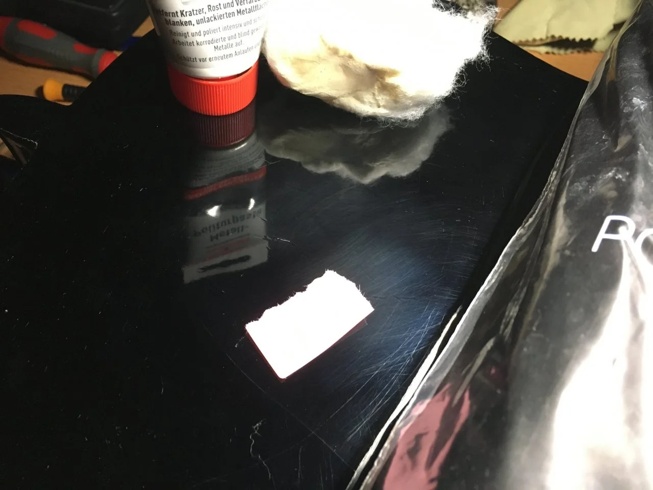 Nun bin ich dabei von Hand mit einer Autopolitur der ganzen Sache Glanz zu verleihen, was sich als anstrengender und langwieriger entpuppt, als gedacht. Auch bekomme ich die ganz feinen Kratzer aus dem schwarzen Lack nicht wirklich weg.
