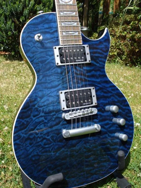Es war wieder einer dieser Momente wenn man den Karton öffnet und es klick macht, die Engel singen und die Glocken läuten. Astrein. Wunderschönes Quilted-Maple Top in blau/schwarz gebeizt, sieht wirklich super schick aus. Ich bin mir durchaus bewusst, dass es sich um ein Furnier handeln muss, aber das ist mir ehrlich gesagt egal, denn die Optik ist der Hammer....
