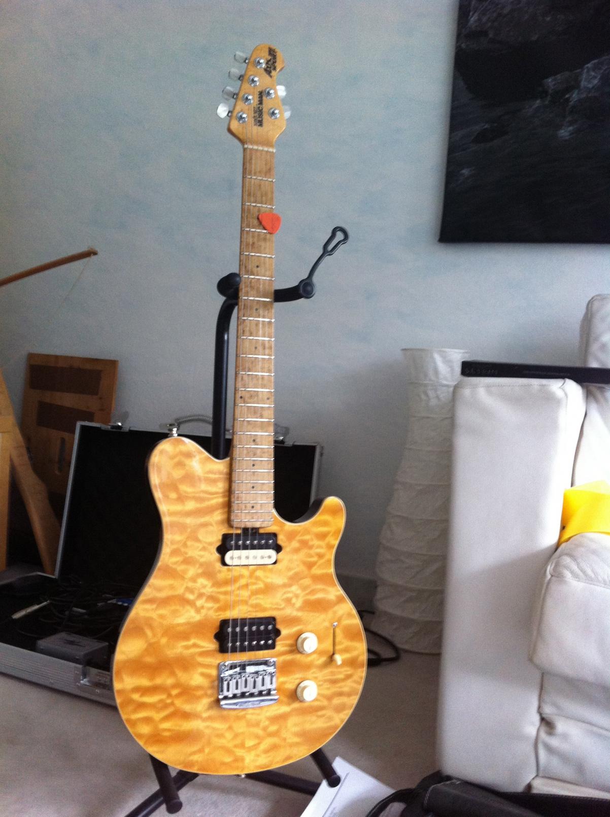 laut dem Vorbesitzer: Ist das ein DiMarzio Custom... allerdings hat er ihn nachträglich reimgeschmissen, da dessen Vorbesitzer einen SH-4 drin hatte. Aber er war froh, dass er überhaupt einen herbekommen hat, auch wenn das jetzt kein Zebra ist. Boahh ich hoffe man kann mein verschachteltes Gelaber irgendwie nachvollziehen!![]()