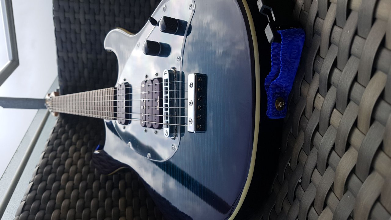 Wie dem auch sei, mit dem Ebenholzgriffbrett der Sonderlackierung mit matching Headstock (...die gewiss nicht jedermanns Sache ist...), finde ich die sehr cool.