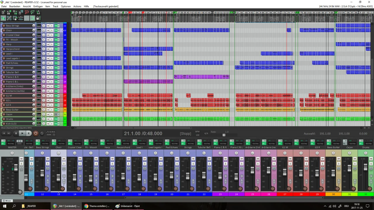 Ich habe mein komplettes Musikprojekt (10 Songs) in einem einzigen REAPER-Projekt. Dies mache ich vor allem deswegen, damit ich, wenn ich etwas allgemein verändern will, dies nicht für jeden Song erneut machen muss, sondern es alles in einem Projekt habe. Dies hat meinen Workflow immens beschleunigt.