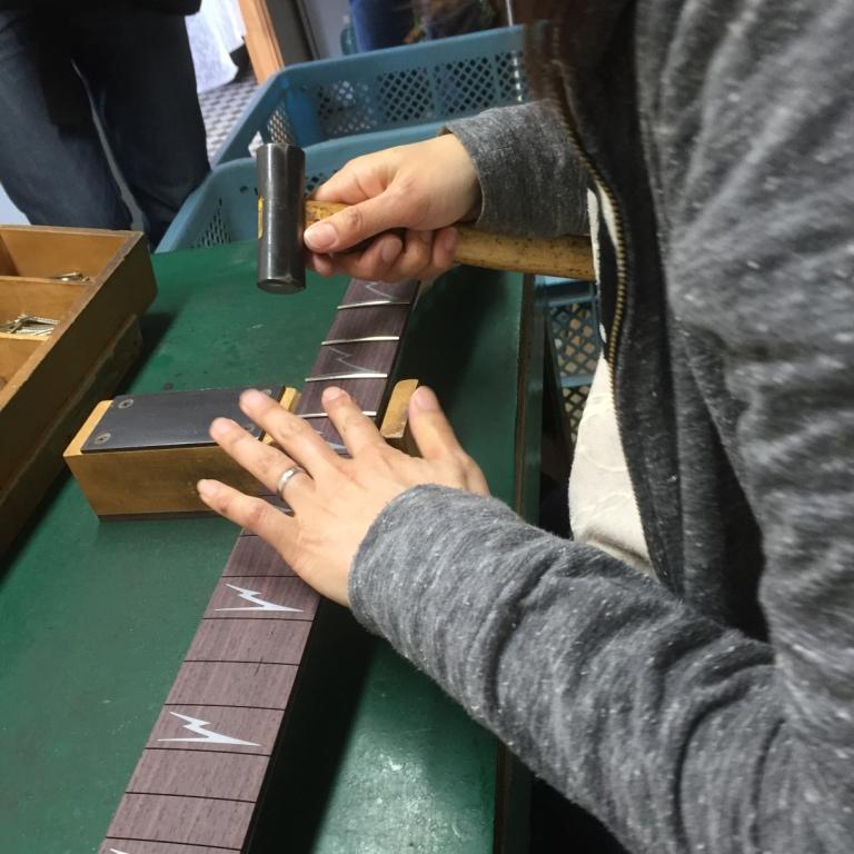 Hier ein Foto aus meinem Fundus, wo direkt mit dem Hammer, nicht einmal aus Kunststoff, bundiert wird, habe ich bei FGN aufgenommen. Auch dort verwendet man kurze, wohl passgenaue Aufnahmen für die Hälse, welche allerdings wesentlich kürzer als die von @murle1 sind.