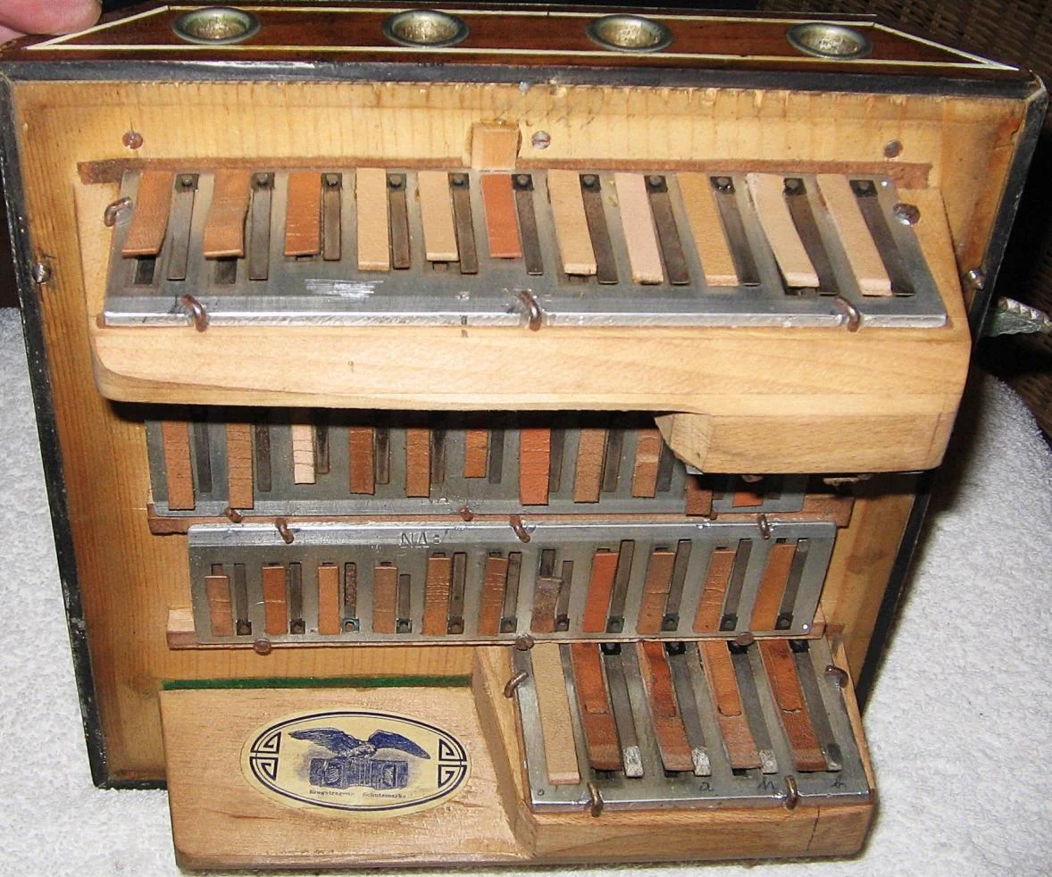 Im internet und in diesem Forum (ich hoffe, ich bin hier richtig) findet man ja einige Hinweise zu Bandoneons; ich finde aber nicht eindeutig heraus, ob es sich um ein Bandoneon oder eine Konzertina handelt. Auch kann ich am oder im Instrument kein Fabrikationsdatum finden. Lediglich im linken Innenteil ist ein Aufkleber eingeklebt. Es scheint mir, dass es ein Instrument von ELA (Ernst Louis Arnold) ist. Auf den Stimmplatten ist NA eingestanzt.