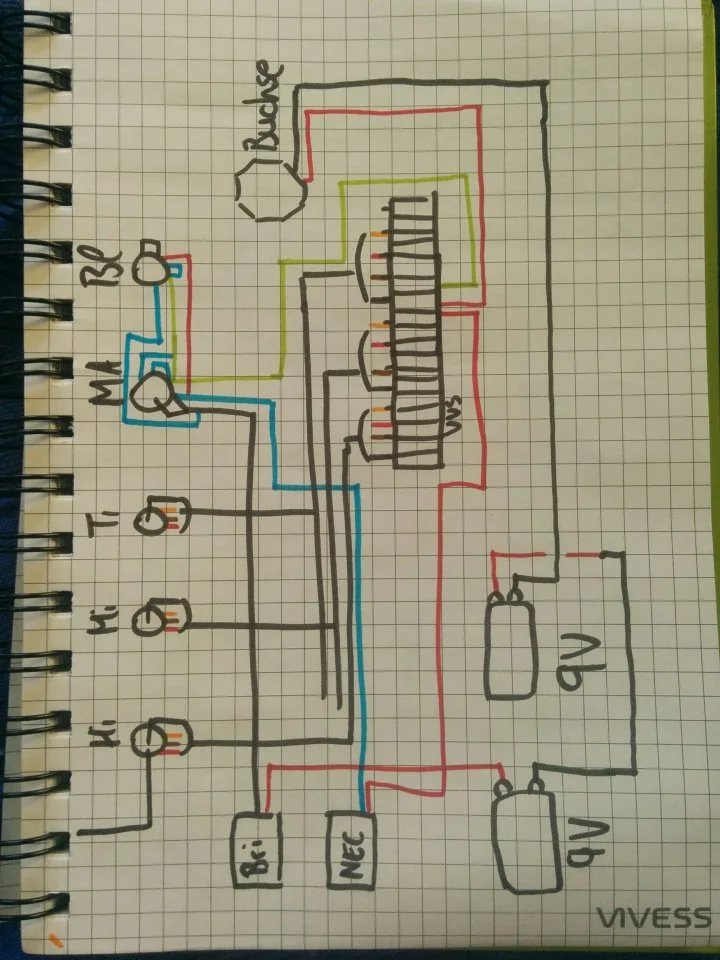 Habe auch versucht den Schaltplan mal abzuzeichnen, aber gebe keine 100%ige Garantie darauf. Bin in Sachen Schaltplänen leider ein ungeschriebenes Blatt.. 🙁 Gegenüber der Schaltung meines anderen Basses wirkt mir das zusammengelötete jedoch irgendwie.. eigenartig (ich kann aber ich falsch liegen 🙂 )