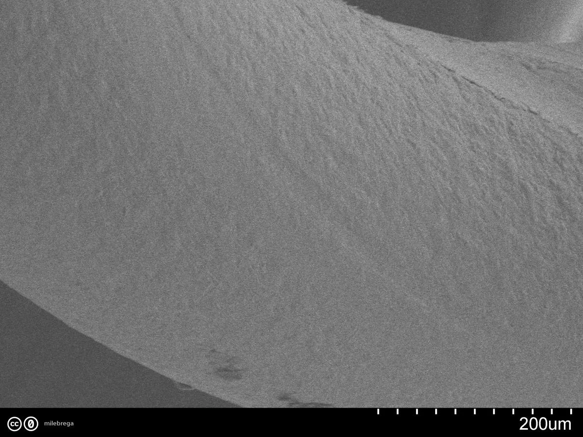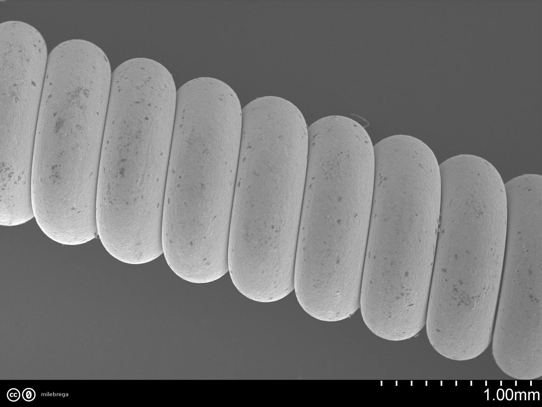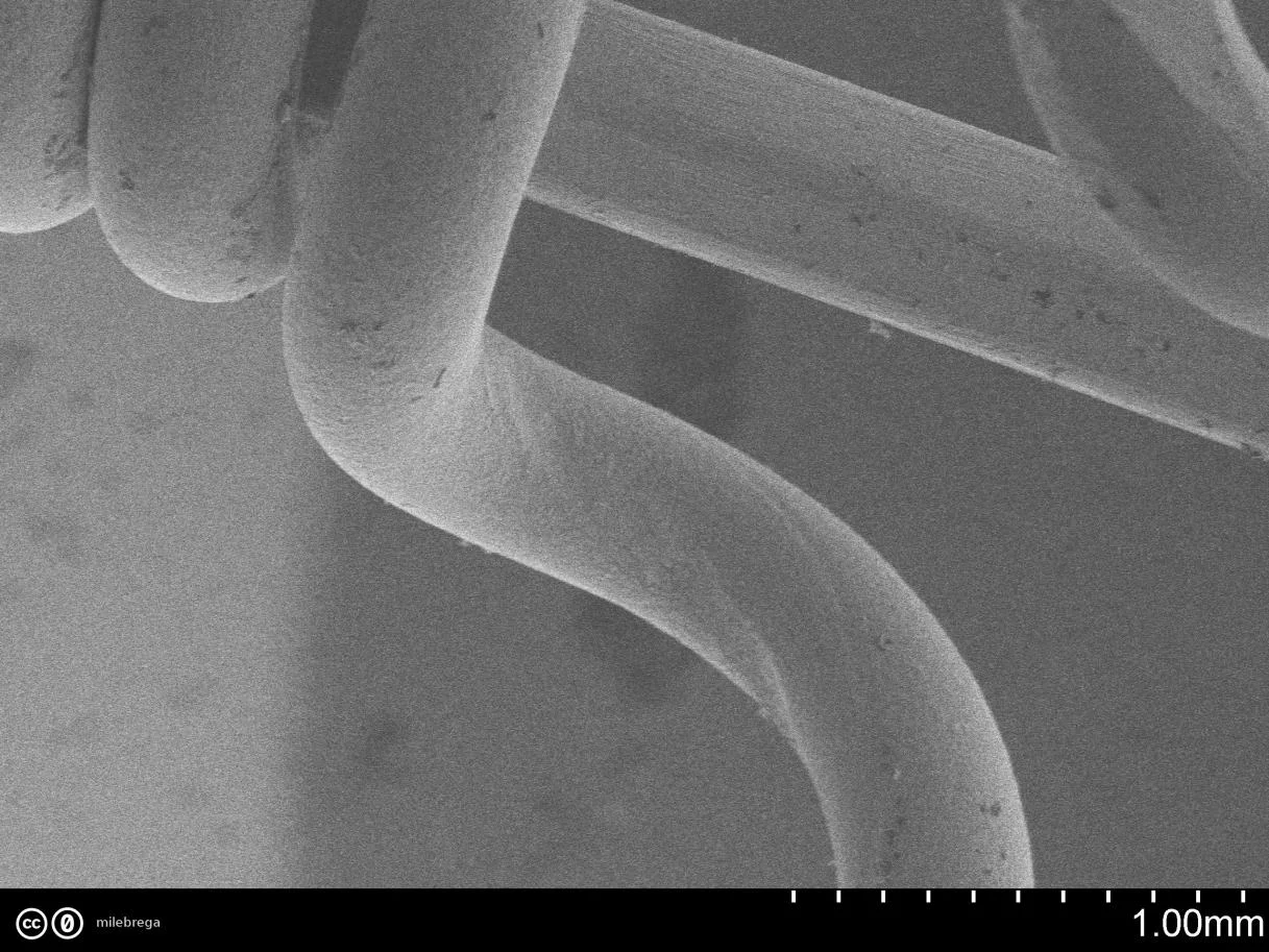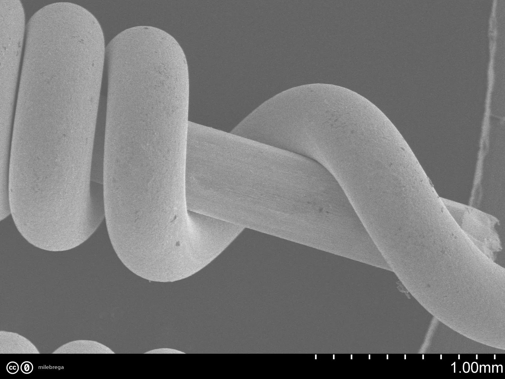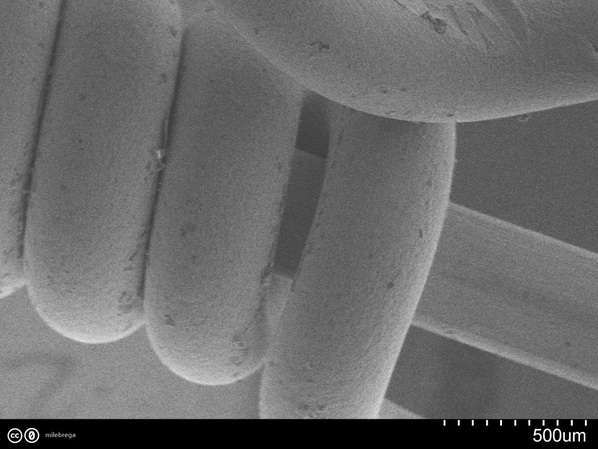 Wie ganz oben auf dem (makroskopischen) Foto zu sehen: Am Ende habe ich die Umwicklung ein wenig aufgedreht (oberes Bild). Die hexagonale Struktur des inneren Drahtes kann man auf den REM-Bilder nicht erkennen... Unteres Bild: hier nur der dünne Umwicklungsdraht. Man sieht rechts einen Abdruck, wo die Umwicklung auf dem Kern auflag.