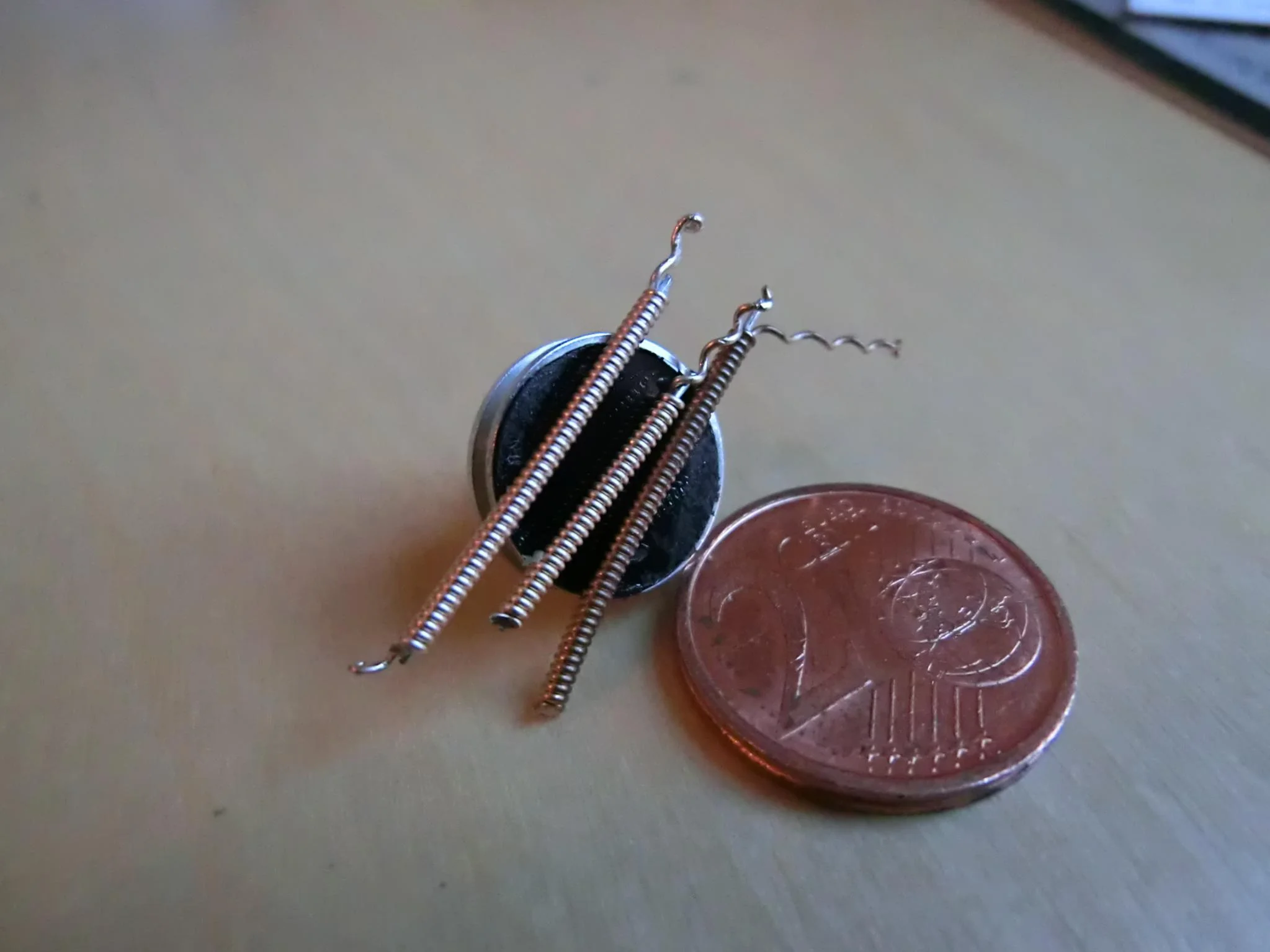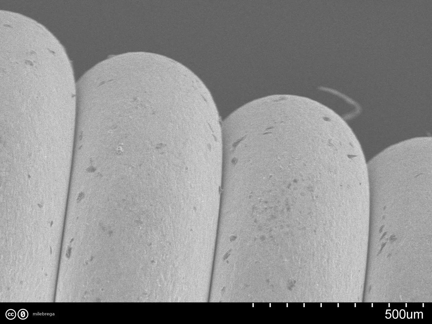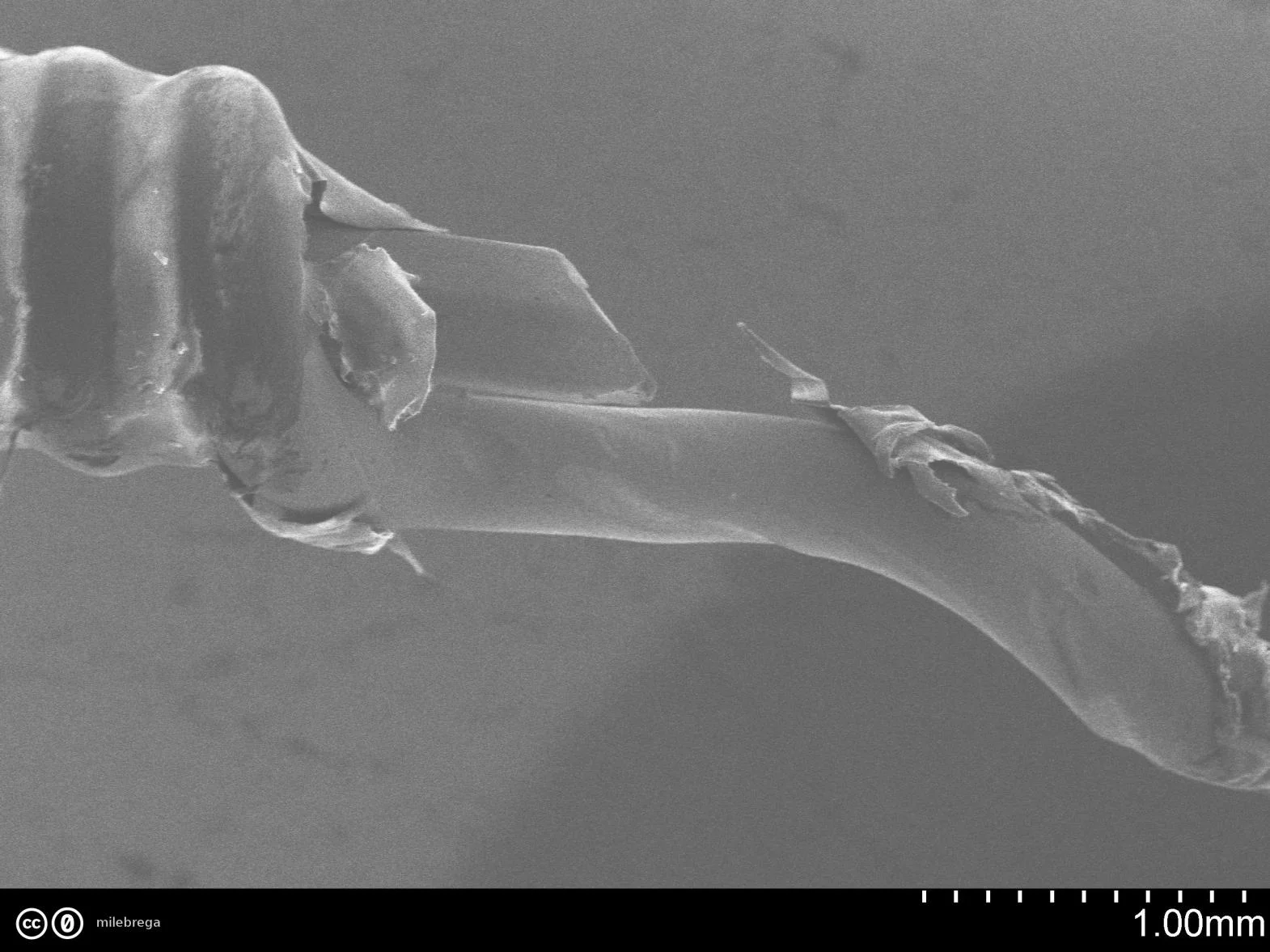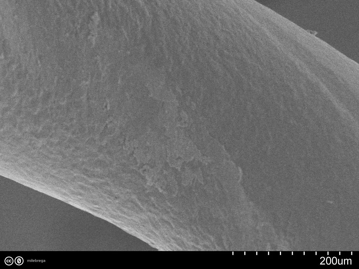 Wie ganz oben auf dem (makroskopischen) Foto zu sehen: Am Ende habe ich die Umwicklung ein wenig aufgedreht (oberes Bild). Die hexagonale Struktur des inneren Drahtes kann man auf den REM-Bilder nicht erkennen... Unteres Bild: hier nur der dünne Umwicklungsdraht. Man sieht rechts einen Abdruck, wo die Umwicklung auf dem Kern auflag.