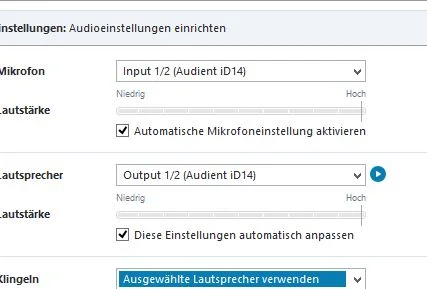 An meinem PC wird sämtlicher Sound über die Abhörmonitore ausgegeben. Die sind ans id14 angeschlossen. Das heißt, ich muß bei Skype als Lautsprecher das Audient auswählen.