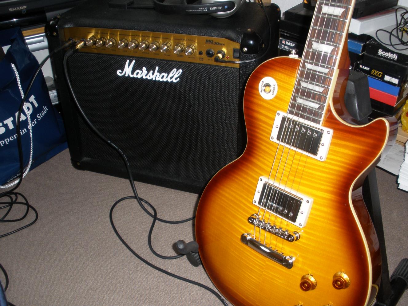 PC260628.jpgPC250617.jpgPC250610.jpgHallo Epiphonisten, sorry, dass es jetzt erst so spät kommt, aber ich bin derzeit im Prüfungsstress und hab gerade nach der Mittagspause durch Zufall mal wieder hier her geguckt :) Also zuerst, meine 1959er hatte ich mir in Ice Tea gekauft. Finish ist wirklich aller erste Sahne. Und auch nicht so, wie auf den Bilder, sondern eher so wie in den USA-Foren. Hatte meine ja an T wieder zurückgeschickt und das Geld wieder bekommen und sie mir dann beim Kölner M bestellt. Für 599 mittlerweile nur noch, und das obwohl sie da bei denen noch für 648 rausging. Aber mittlerweile glaube ich auch schon für 599. Jedenfalls kam sie vorgestern an, und bis auf eine trotz wahnsinnig pompöser Verpackung mit ca 1t Luftkissen und Kartonage ohne Ende abgebrochene Toggle Switch Kappe ist alles super dieses Mal. Mein Problem, es war kein Kratzer an dem Teil, sondern der offensichtlich schlecht gekerbte Sattel, hat sich hier nicht wieder eingestellt. Hab aber nur vorgestern mal kurz geschaut, ob alles funzt, weil wirklich keine Zeit. Aber ich hab kurzerhand die Toggle Switch Kappe meiner Billigen SG-Kopie darauf geschraubt, diese steht ja jetzt eh nur in der Ecke :D Jedenfalls Verarbeitung ist jetzt wirklich top. Allerdings muss ich sie wohl nochmal einstellen lassen, weil ich ganz schön starkes Saitenklirren (also Scheppern auf den Bundstäbchen habe). Hab schon versucht, das durch Anheben der Bridge versucht, und ca 4mm auf dem 12 Bund gehabt, aber trotzdem, und so wummer ich nicht drauf...Also nehme ich an, dass der Hals zu gerade ist. ICh bin ja aber kein Fachmann und auch mit dem Thema Les Paul erst Anfänger, wenns darum geht, eine zu besitzen. Hat jemand eine genaue Anleitung, wie ich das evtl. selber machen könnte? Ich kenne zwar den workshop von rockinger.de oder so, aber ich stelle mich zum einen zu blöd an, diesen flagolettton hinzubekommen und zum anderen traue ich mich (noch) nicht, an dem Baby rumzuwerkeln. Aber mal schauen.