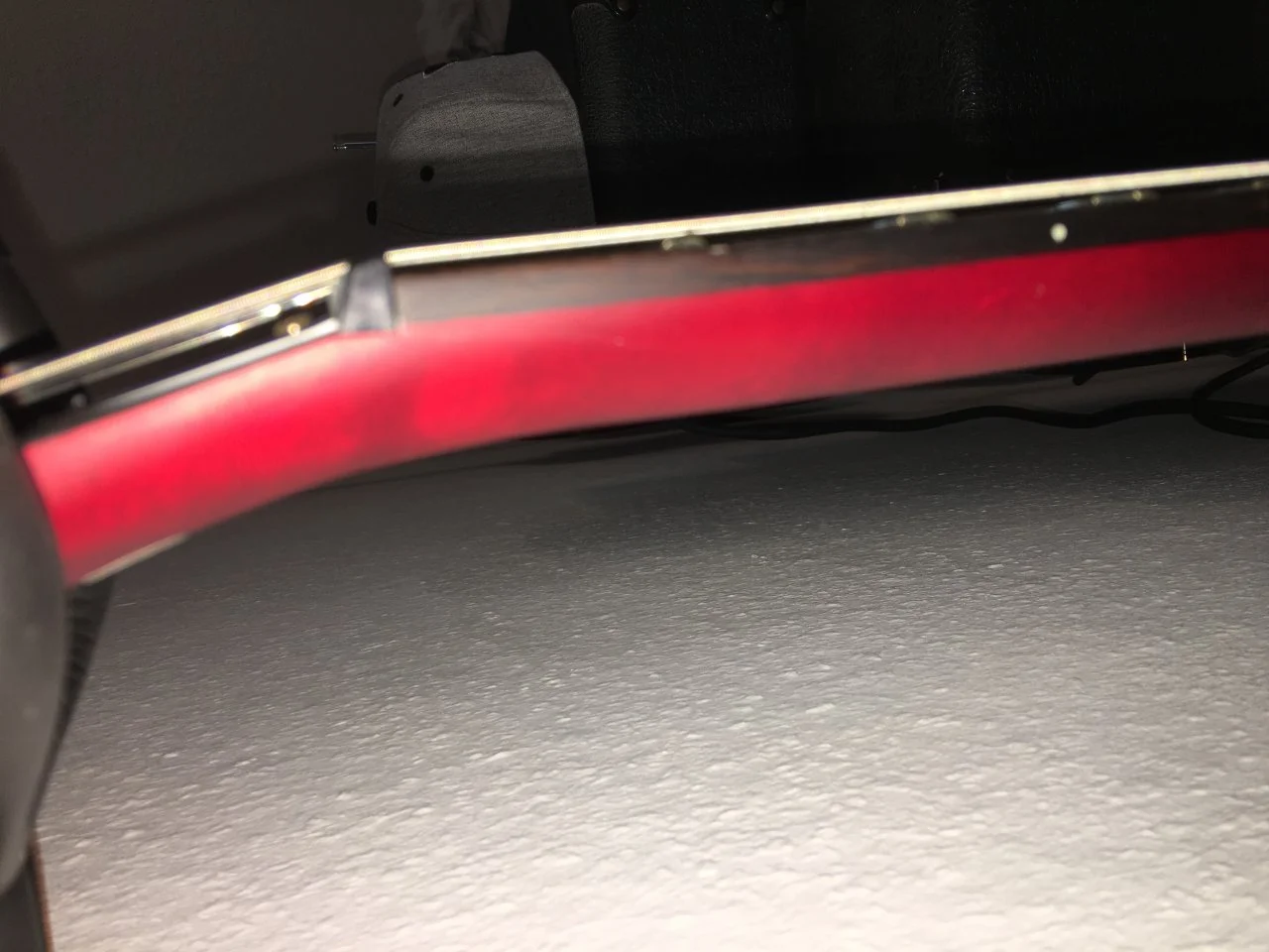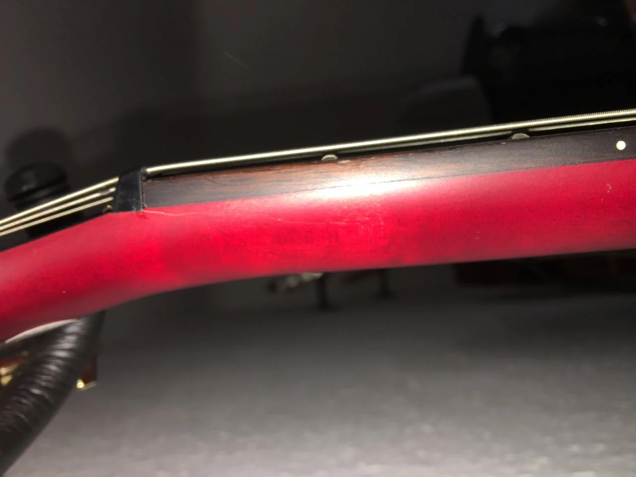 Beim Proben ist mir nun vor kurzem ein "Haarriss" im Holz des Halses aufgefallen, auf höhe der ersten 3 Bünde, etwa 5-6 cm lang, aber so schmal und dünn, dass man ihn nur sieht wenn man gegen das Licht guckt und auch nur spürt wenn man wirklich mit dem Fingernagel darüber fährt (siehe Bilder).