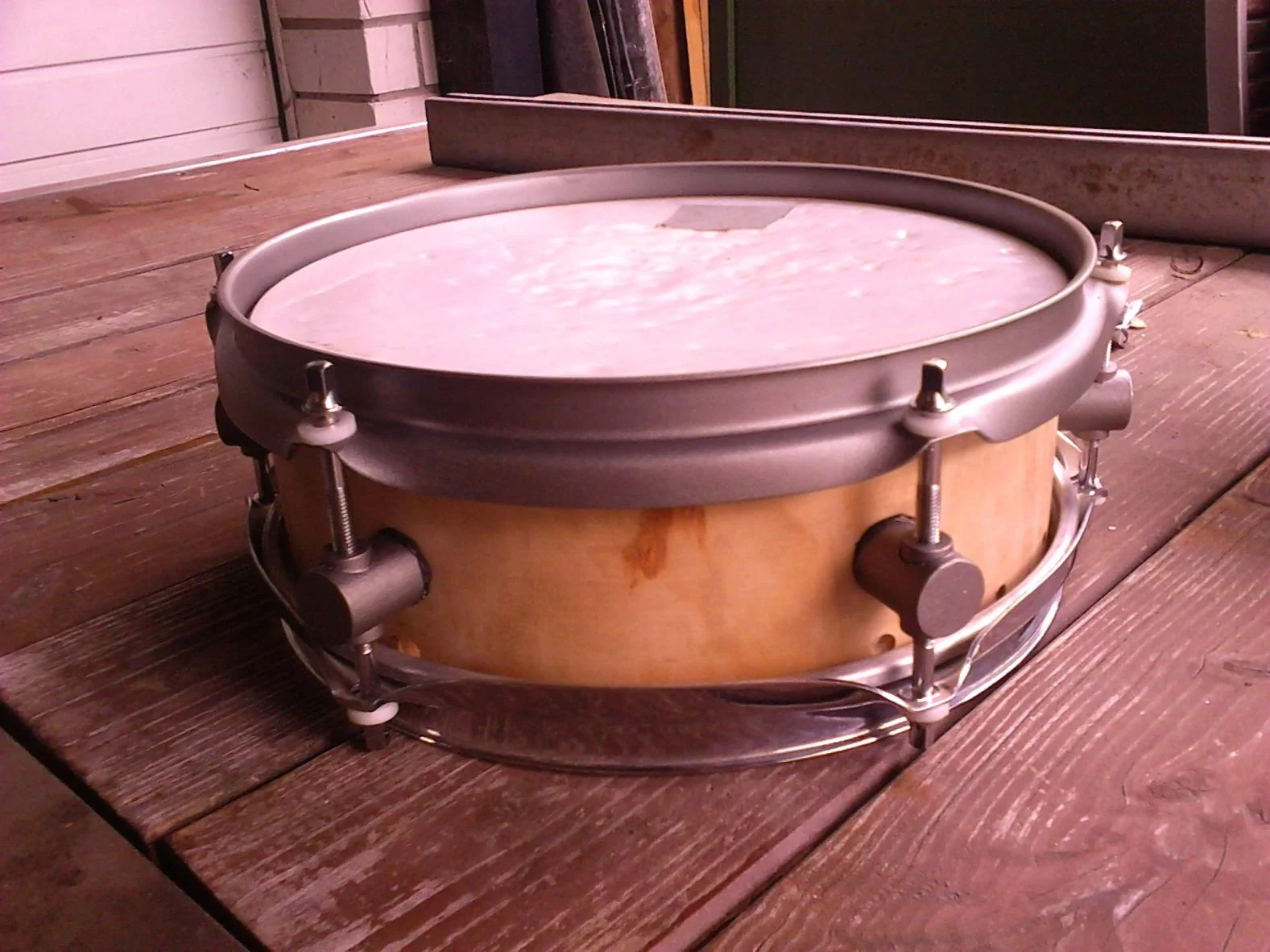 Hey leude hab heute mal damit angefangen meine erste eigene Snare zu bauen,das Projekt war eigentlich nur zum üben und für den Spaß gedacht und um mich ersma mit der Materie etwas vertraut zu machen^^Also bin ich in den Keller gegangen hab mein altes Basix aus der Ecke gekramt und mir die 10" Tom geschnappt.Problem bei der Sache war dieses große Loch wo man die Stange zum befestigen reinsteckt, weshalb die "Snare" nicht gerade sehr tief ist, ich hab den Kessel dann so knapp es geht vor dem Loch mit der Bandsäge durchgesägt. Wie tief genau sie ist weiß ich nicht genau ^^Da ich den Kostenaufwand möglichst gering halten wollte habe ich mir keine Spannböckchen gekauft und mir aus einer 25mm und einer 12mm Welle 6 Stück zusammengebastelt und mit Edelstahlspray lackiert(den Spannreifen auch). Unsere Säge,Bohrmaschine und Drehmaschine laufen leider nicht mehr komplett rund und zu 100% gerade weswegen sie nicht wirklich perfekt sind aber sie funktionieren, schnell noch die Spannschrauben auf die richtige länge abgeschnitten und montiert.Das ist ersteinmal das Zwischenergebnis jetzt brauche ich noch einen Strainer und einen Spannreifen für das Resonanzfell wobei ich nicht genau weiß welchen ich mir da besorgen soll bei stdrums hab ich irgendwie keine gefunden o.o vielleicht kann mir da wer weiterhelfen das wär nett ^^