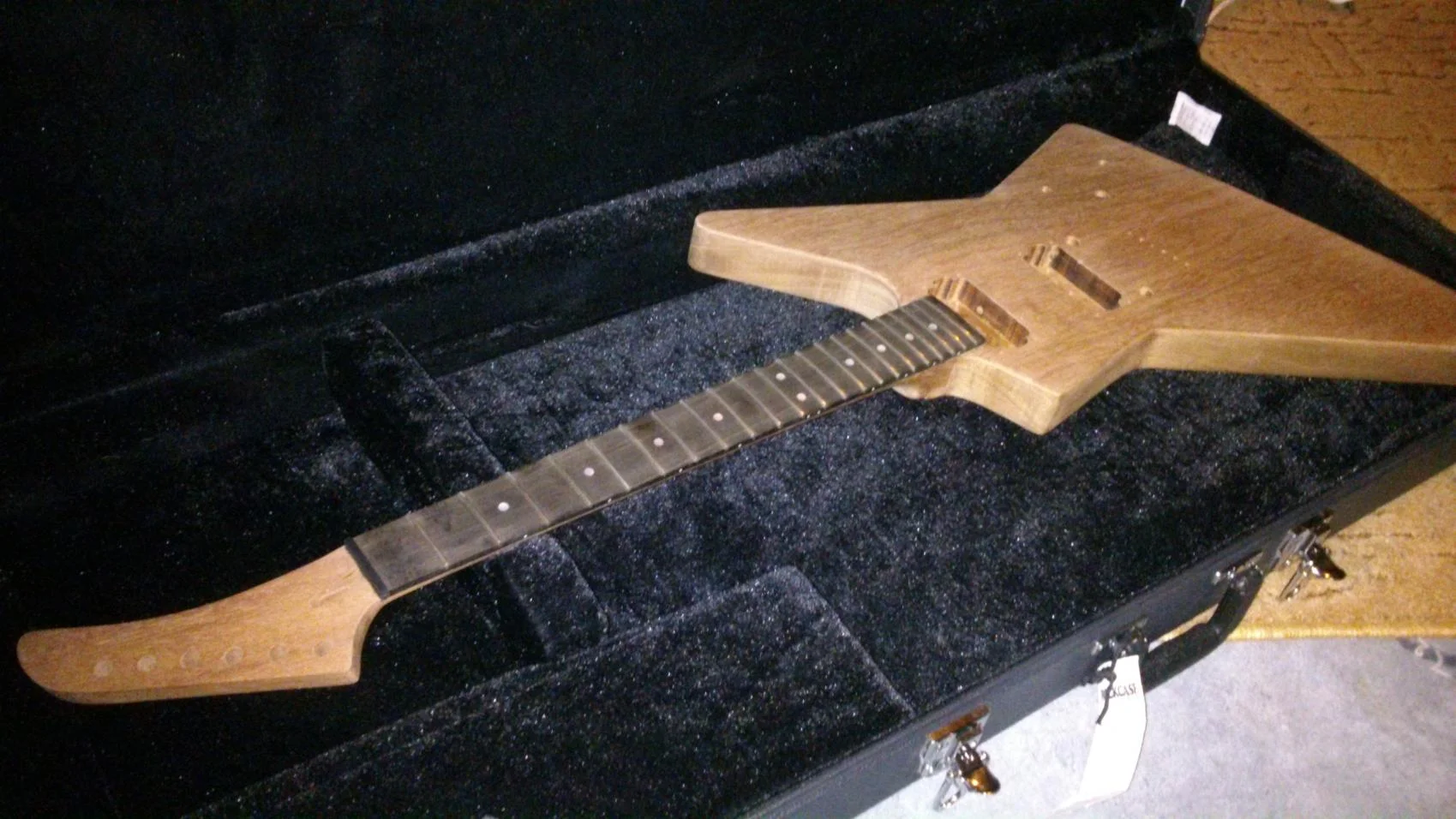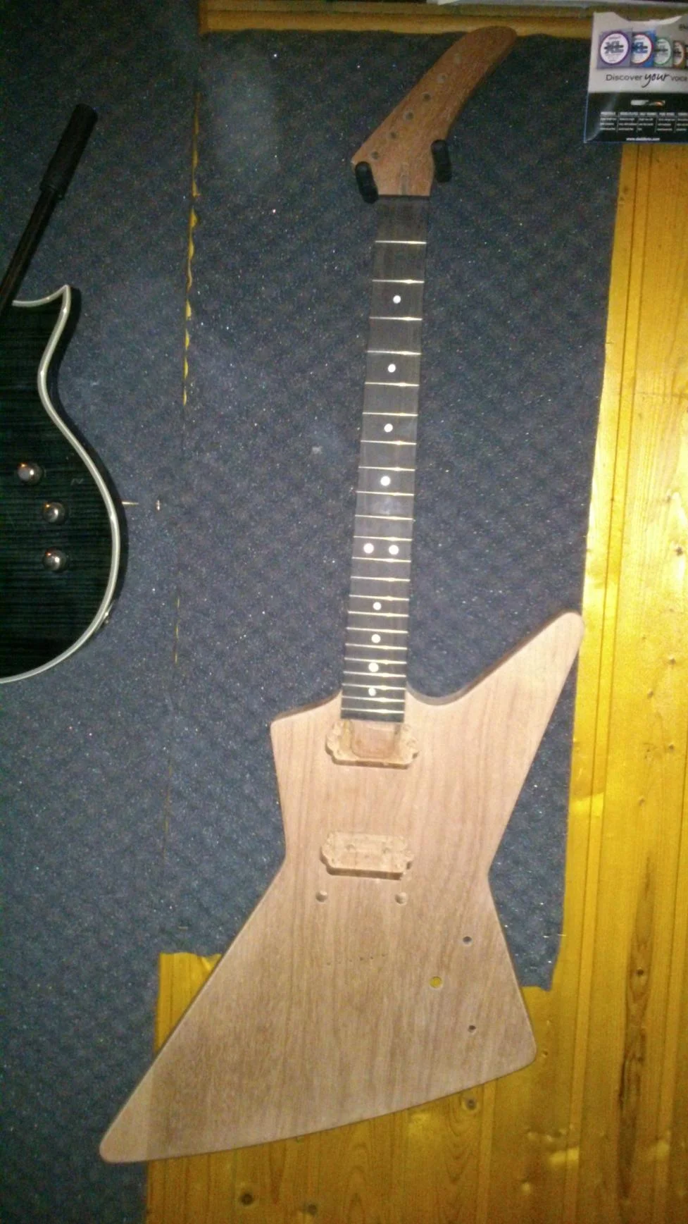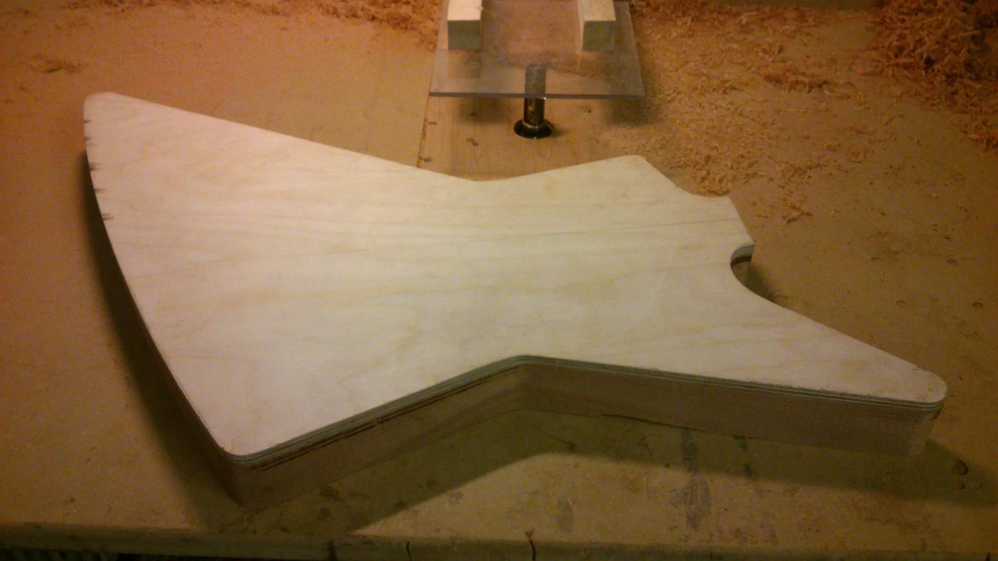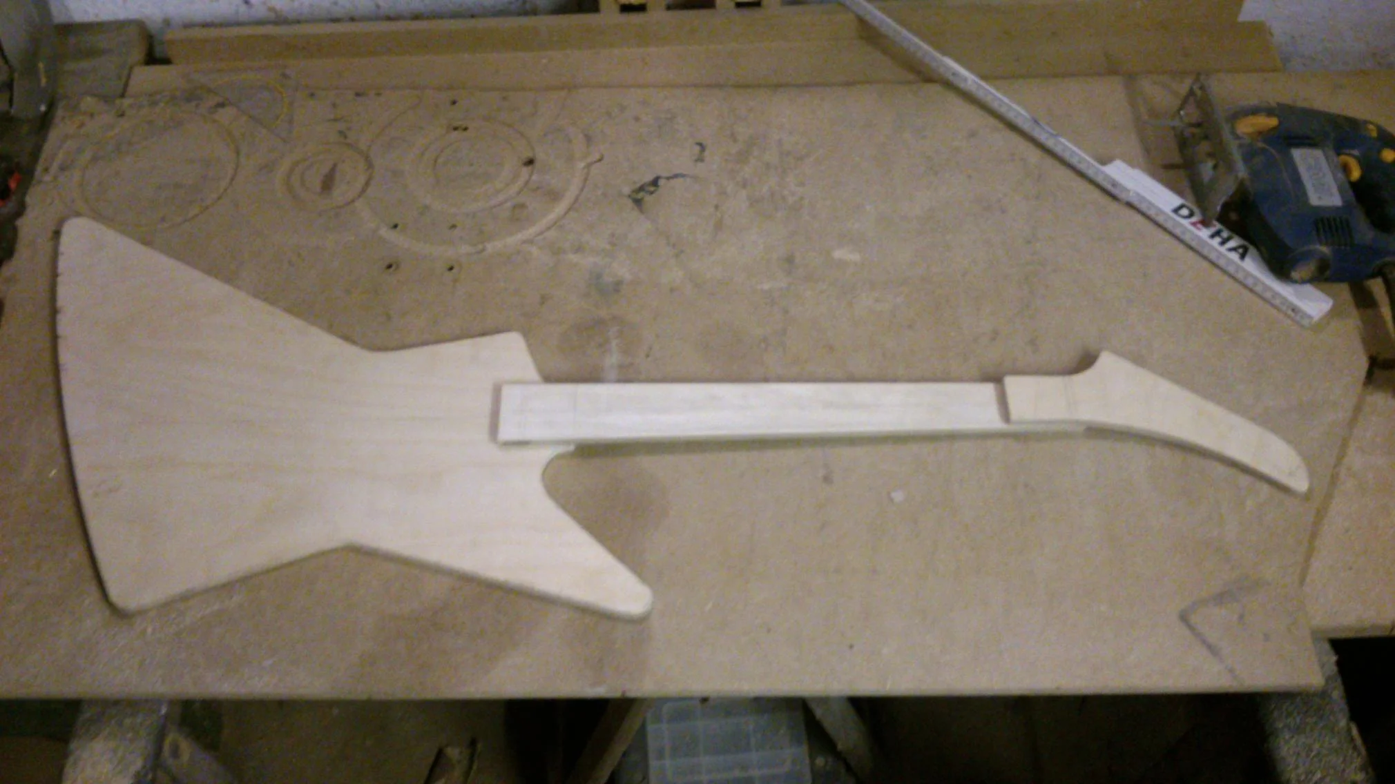 Um die Sache möglichst einfach zu halten, habe ich nach einer Gitarrenform gesucht, die ohne viel Schnickschnack wie Bindings und gewölbte Decke auskommt. Also habe ich mir für eine Explorer entschieden.