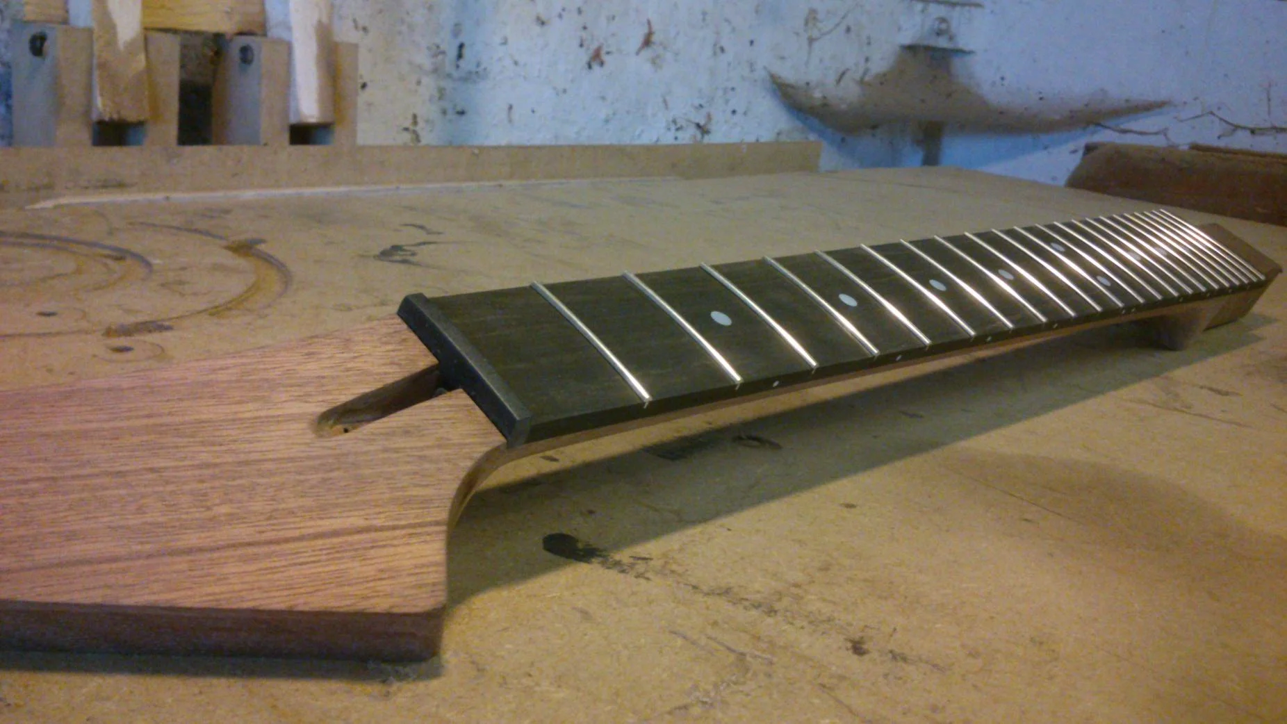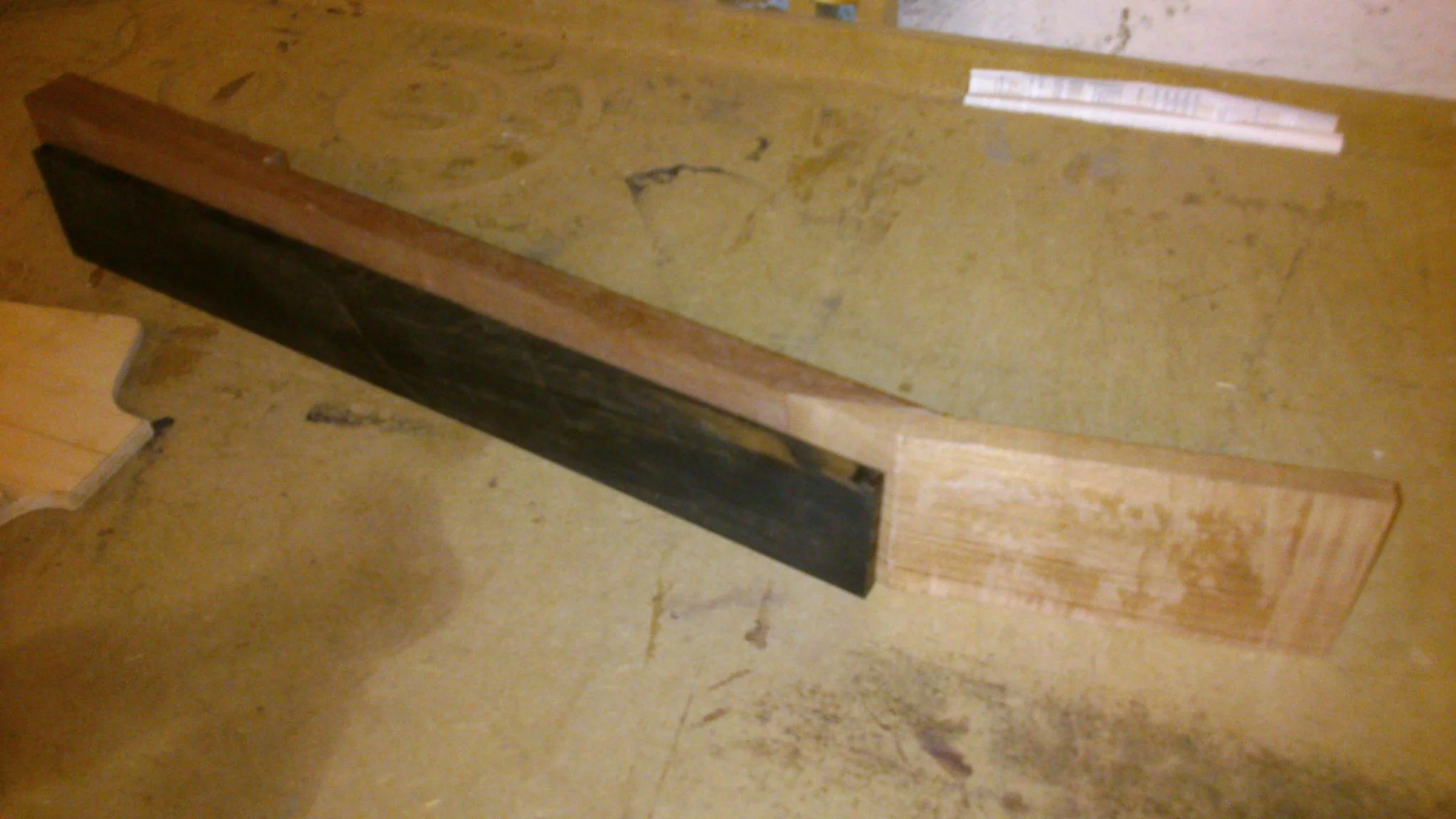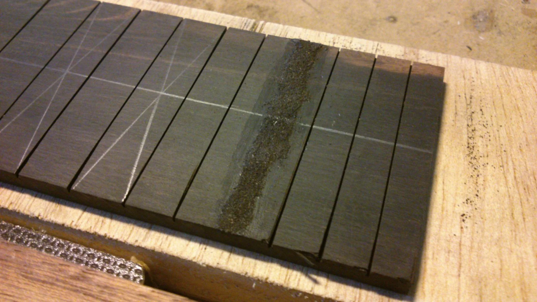 Als nächstes habe ich mich an das Griffbrett gemacht. Mit einer dünnen Japansäge habe ih die Bundschlitze gesägt wobei mir dann wieder ein fehler unterlaufen ist. Ein Bundschlitz war derart schief, dass ich ihn mit einer Selbstangerührten Paste aus Holzleim und Ebenholzspäne wieder verschlossen habe: