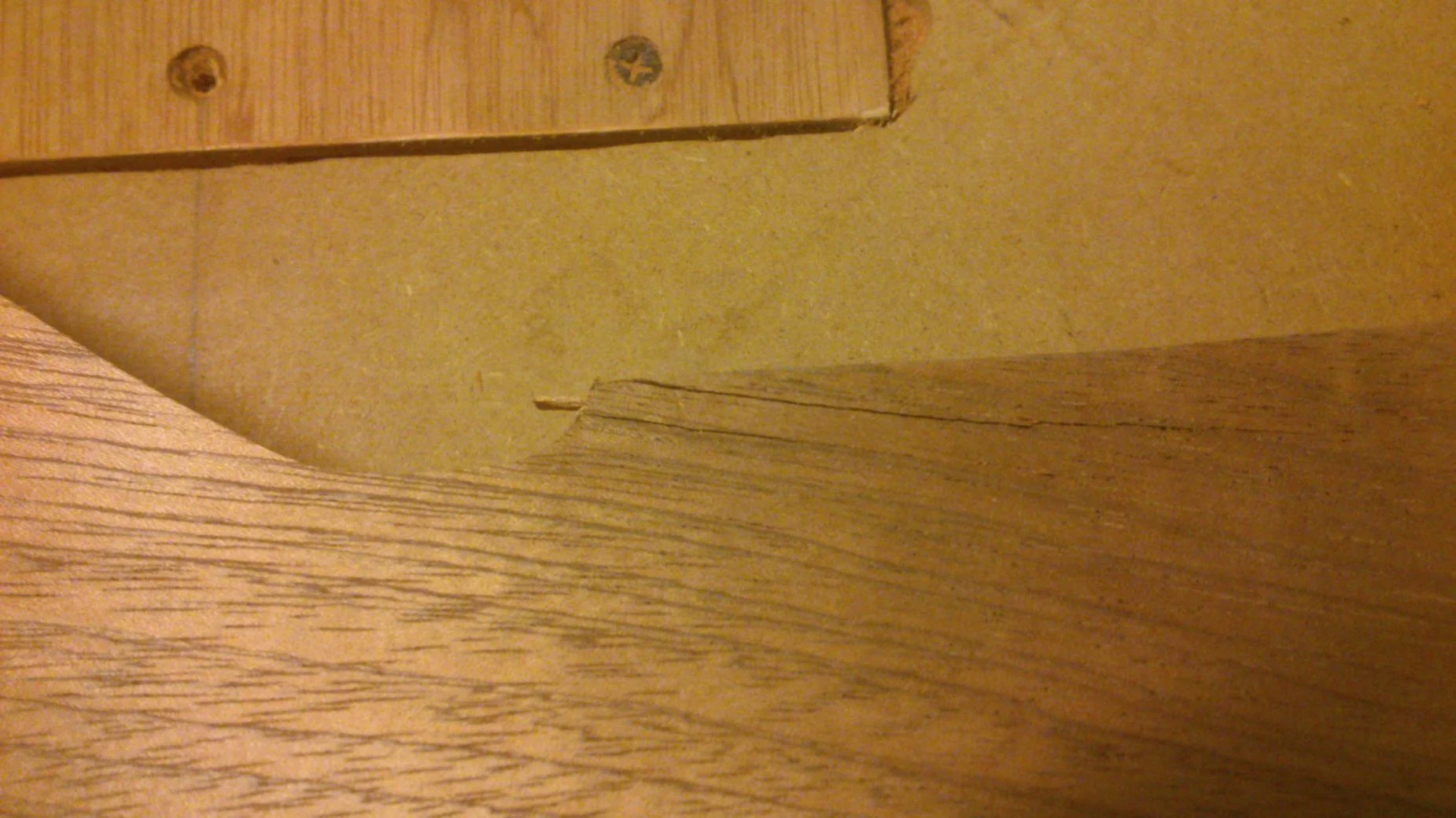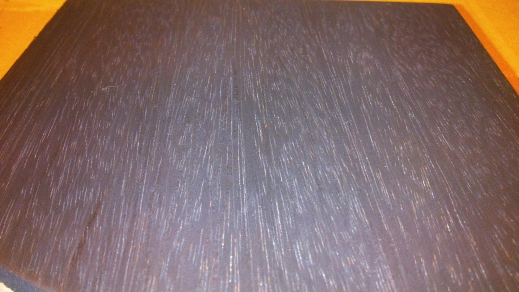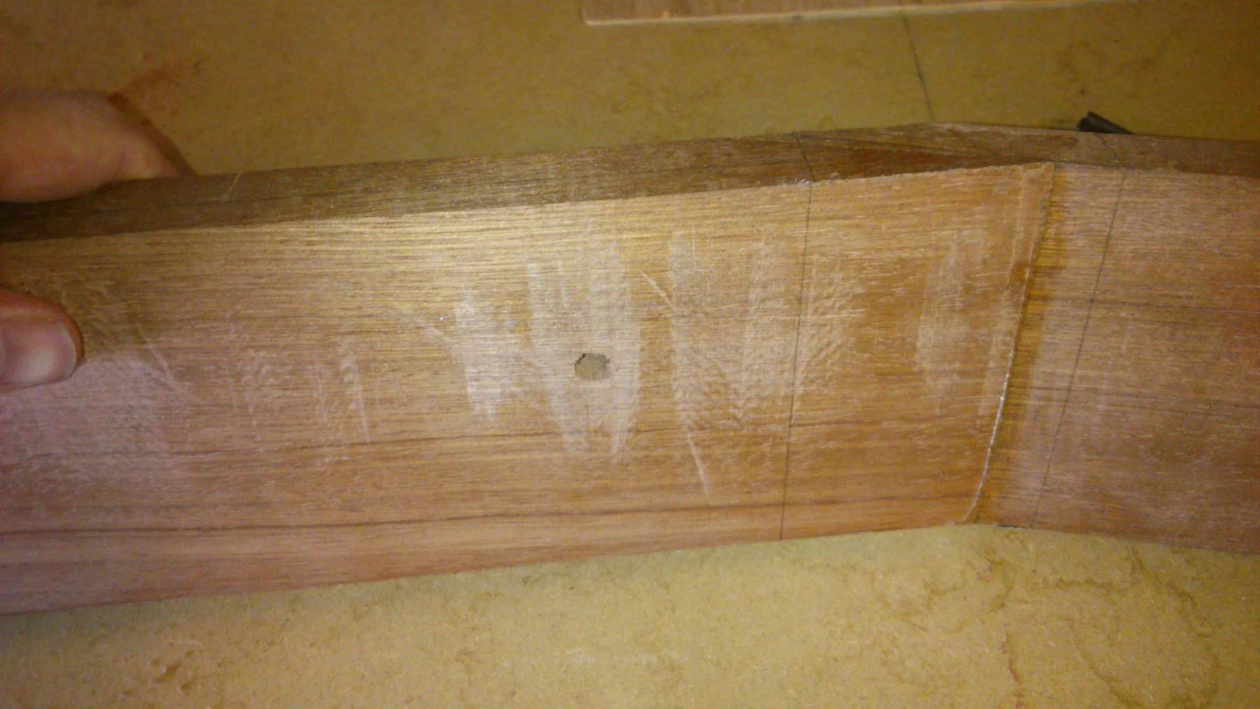 Als nächstes habe ich mich an das Griffbrett gemacht. Mit einer dünnen Japansäge habe ih die Bundschlitze gesägt wobei mir dann wieder ein fehler unterlaufen ist. Ein Bundschlitz war derart schief, dass ich ihn mit einer Selbstangerührten Paste aus Holzleim und Ebenholzspäne wieder verschlossen habe: