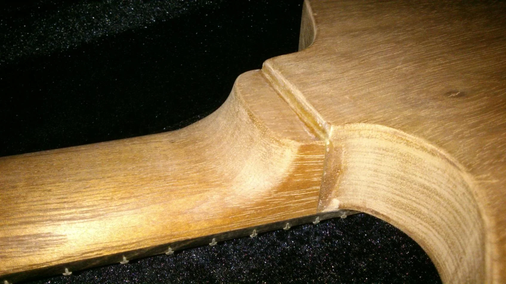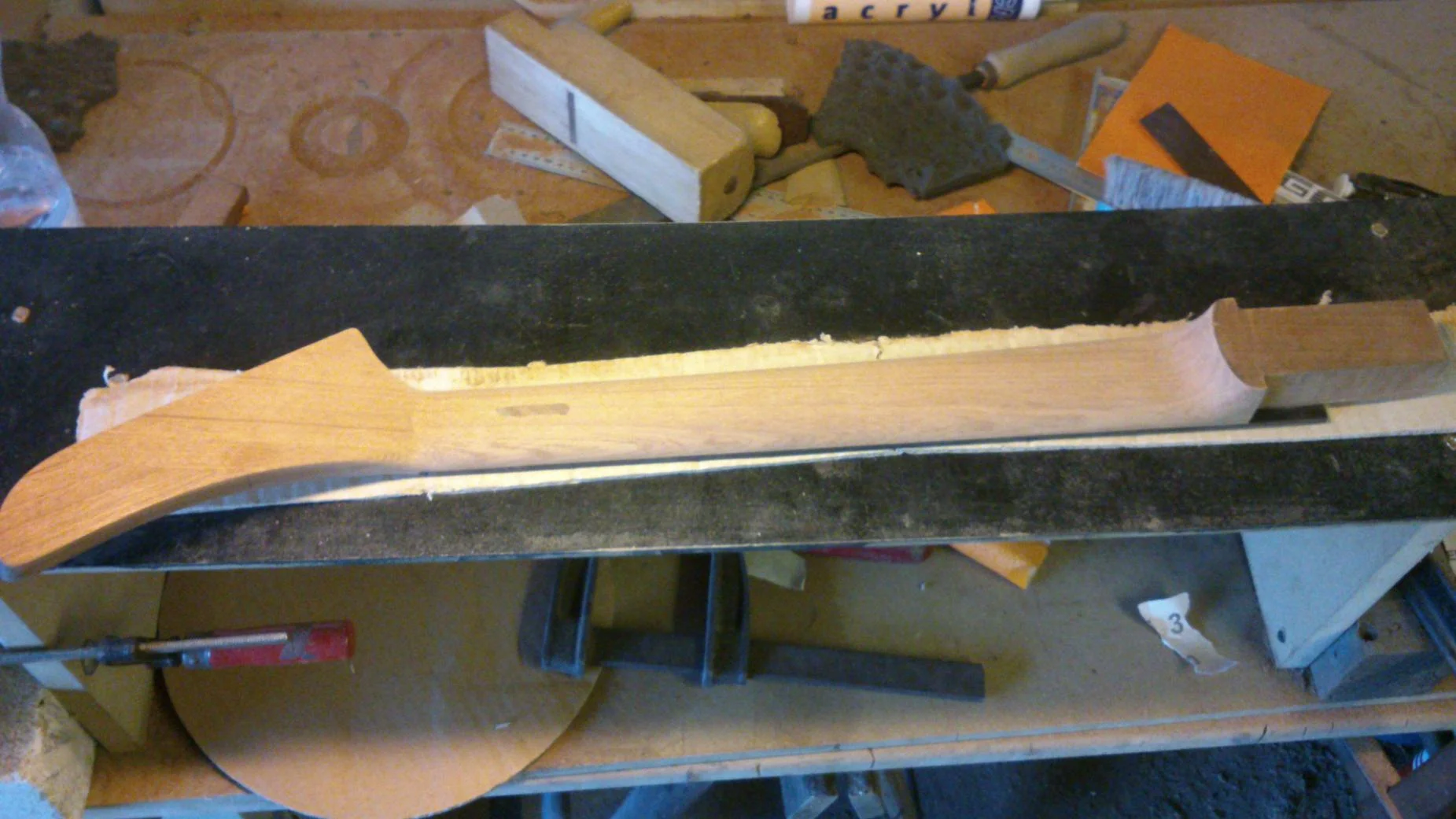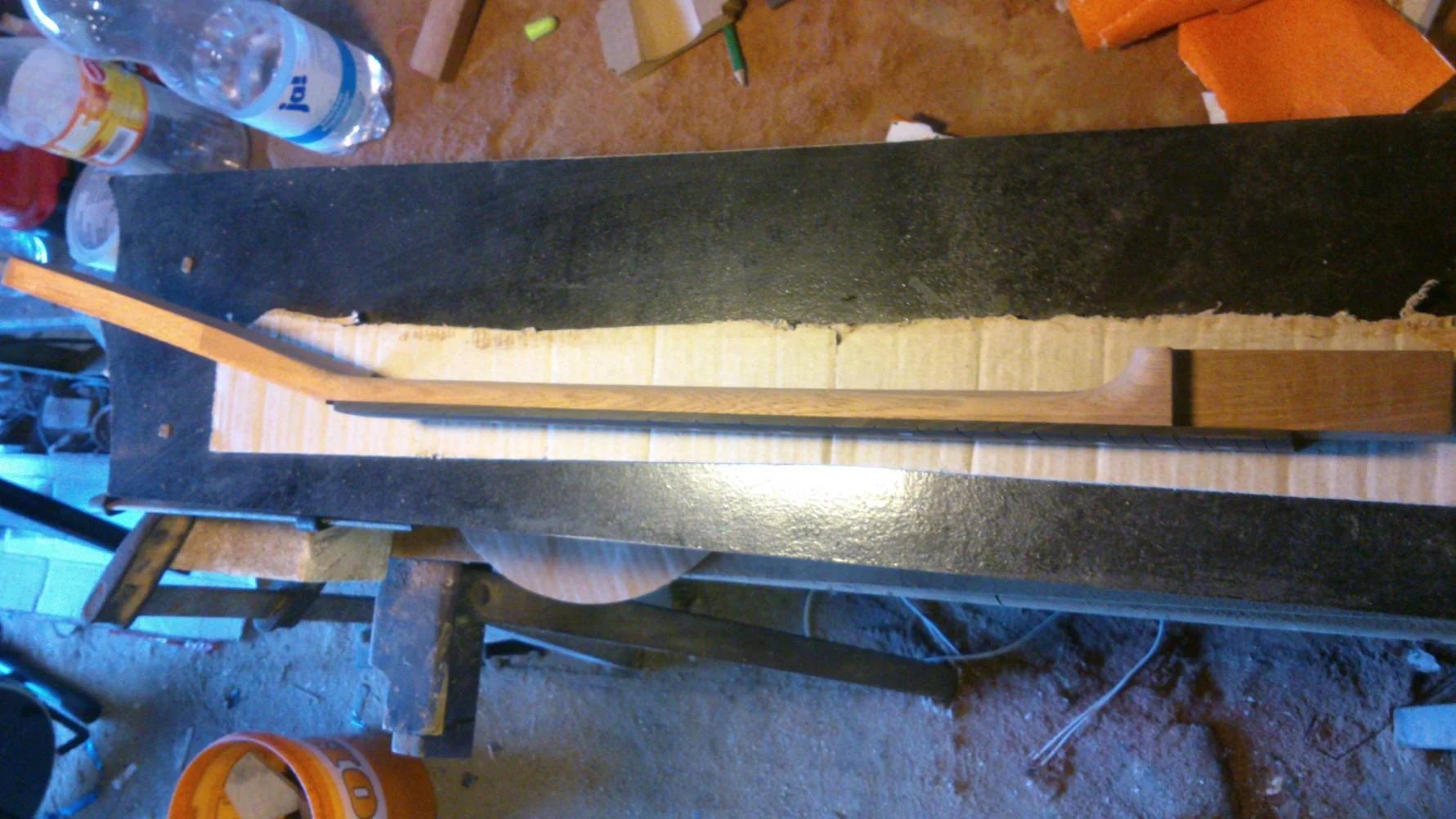 Angefangen habe ich dann mit dem Hals indem ich die Kopfplatte abgesägt und in ca. 15° Winkel wieder angeleimt habe. Das Griffbrett liegt da nur zu Anschauungszwecken: