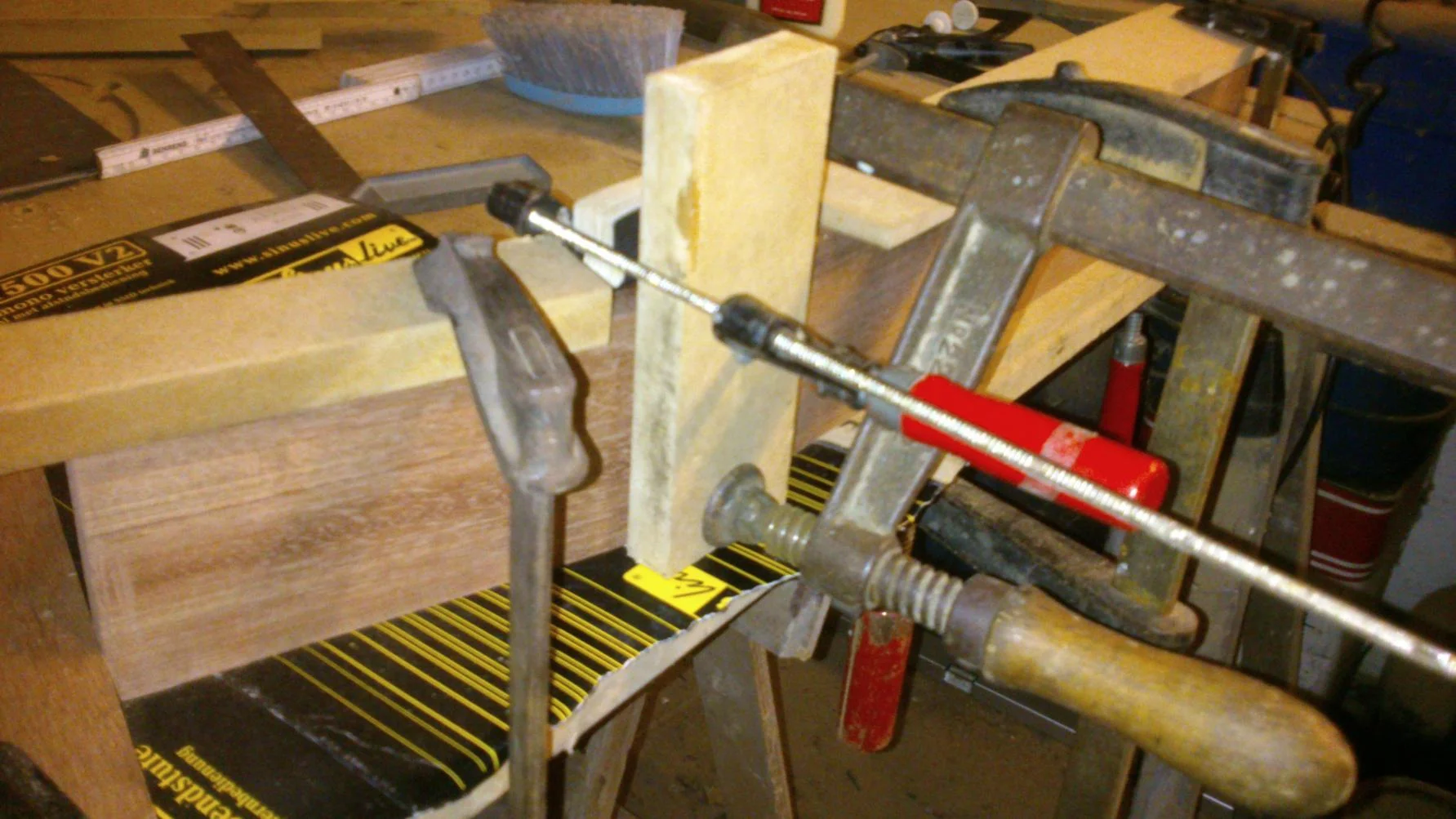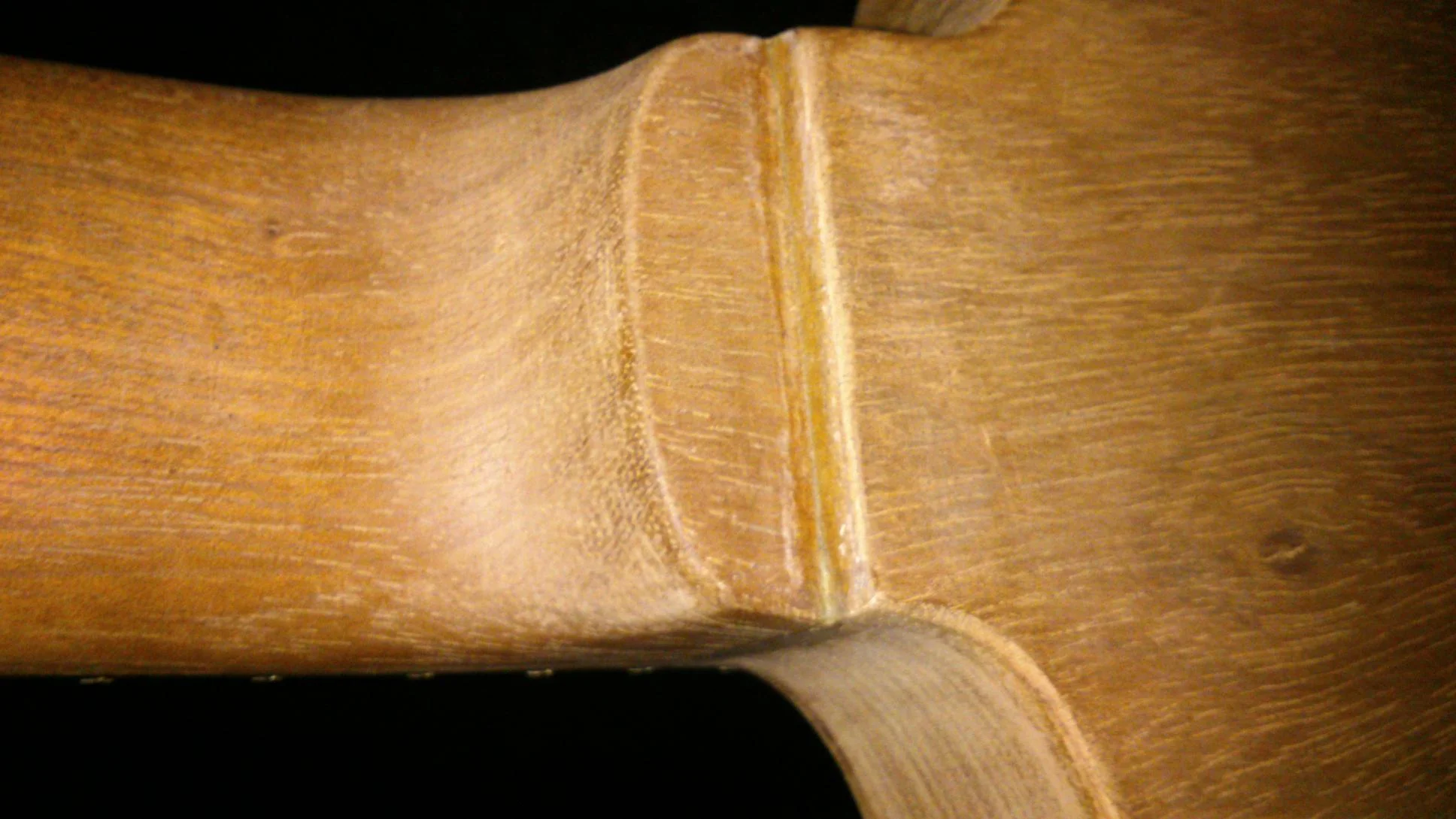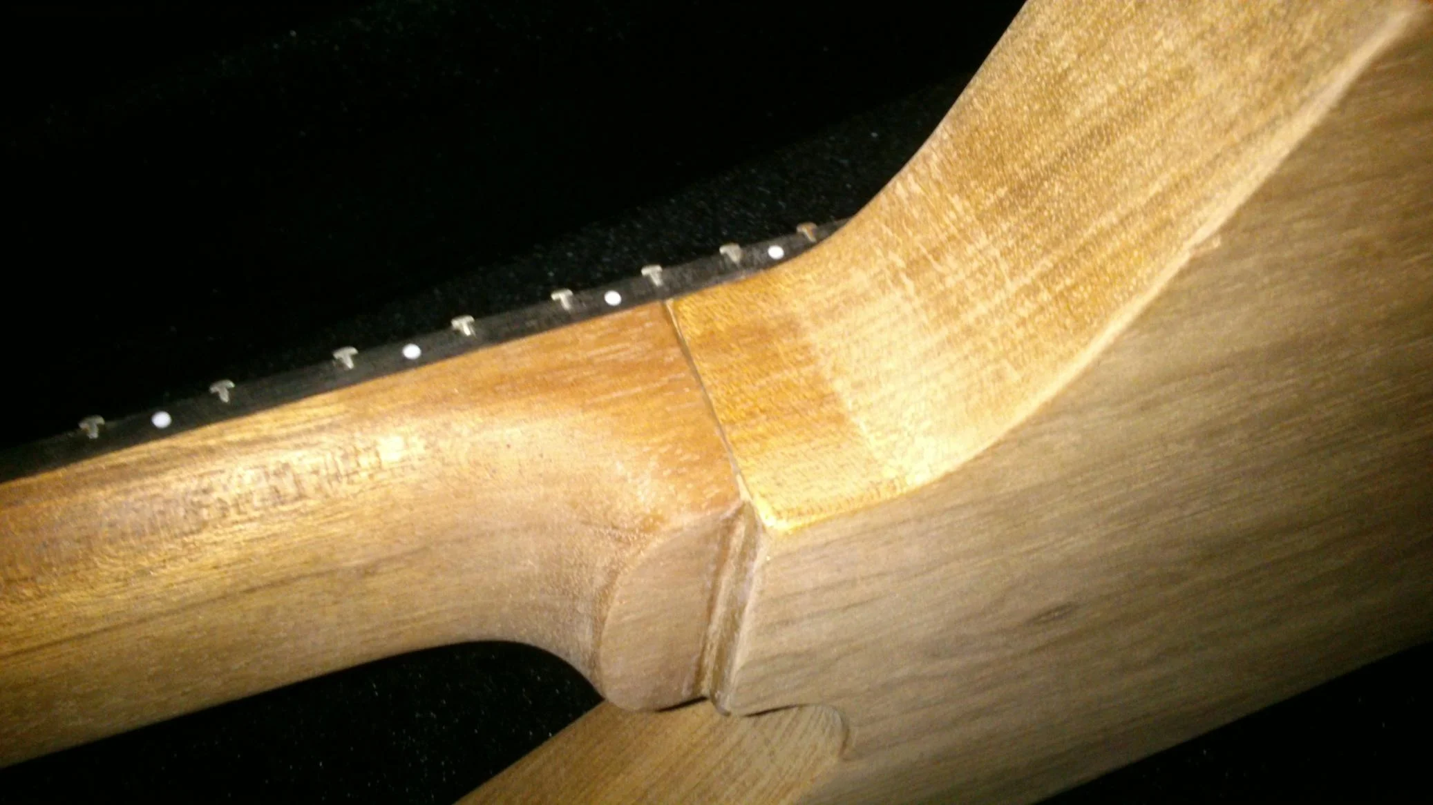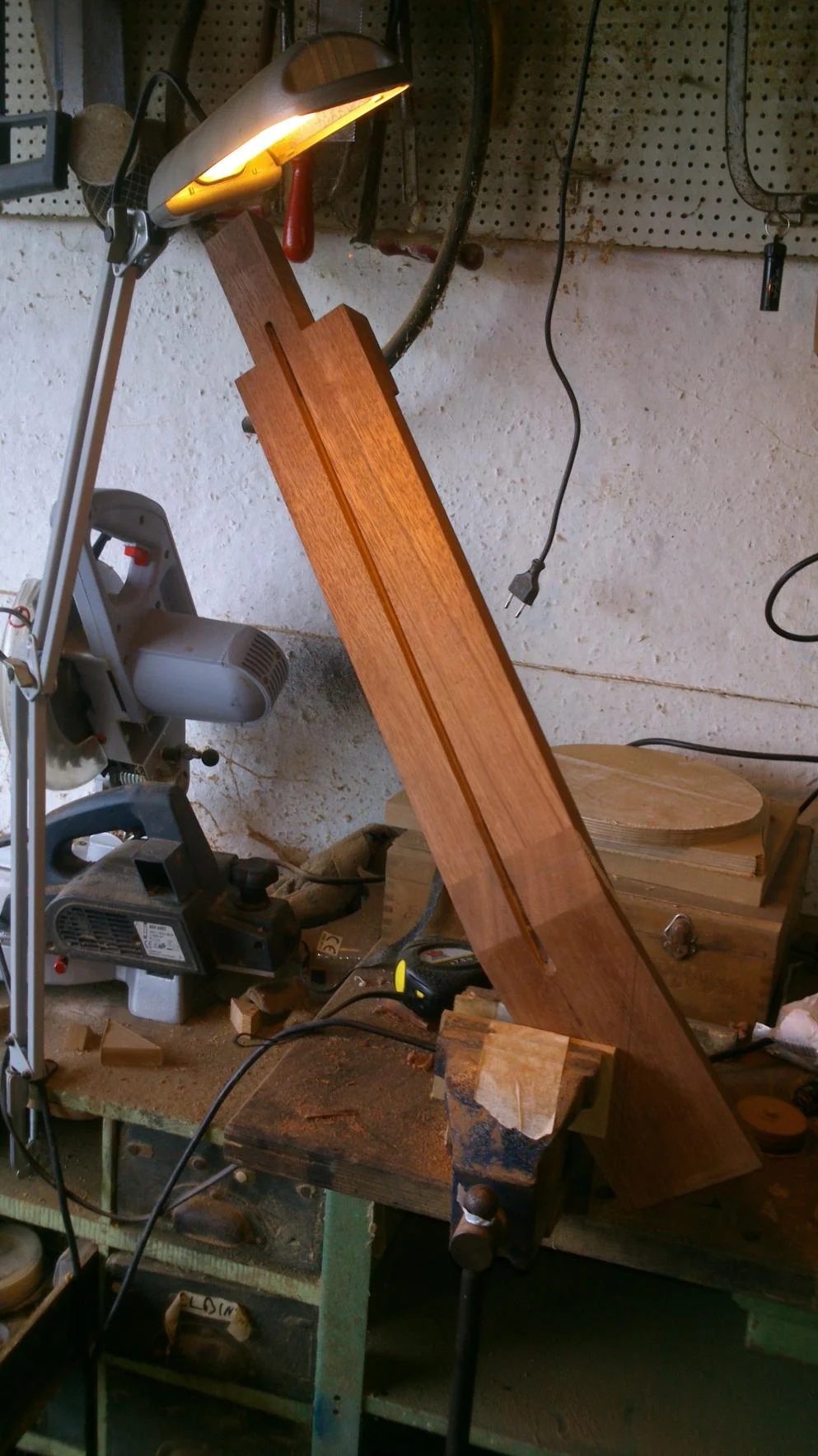 Angefangen habe ich dann mit dem Hals indem ich die Kopfplatte abgesägt und in ca. 15° Winkel wieder angeleimt habe. Das Griffbrett liegt da nur zu Anschauungszwecken: